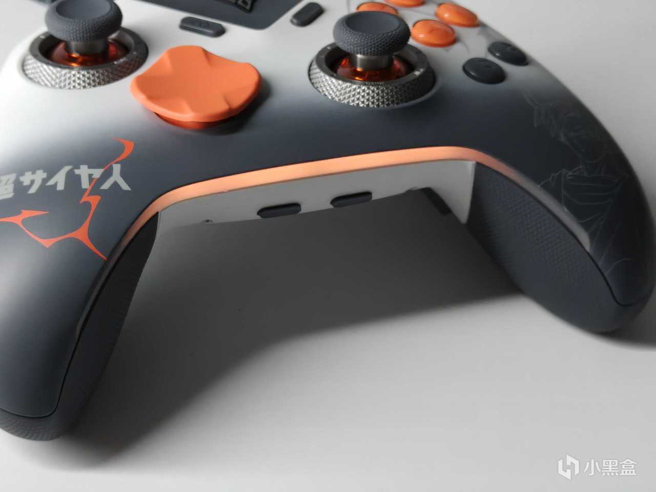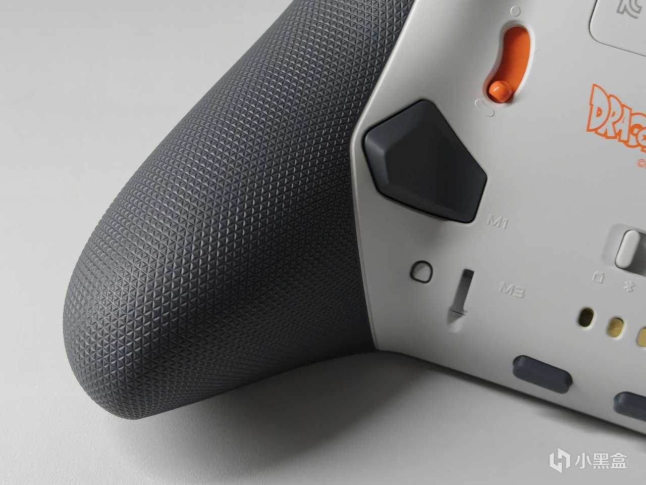 先看手柄外觀,第一眼看上去感覺沒什麼特點,但是仔細看看聯名元素其實表現的非常恰到好處。機身延續包裝的灰白漸變配色,底部顏色加深,有一種黑白灰的漫畫質感,這種靜逸的安靜一下子又被那龍珠標誌性的橙色點綴所打破,比單調的純色設計更加視覺層次感十足。