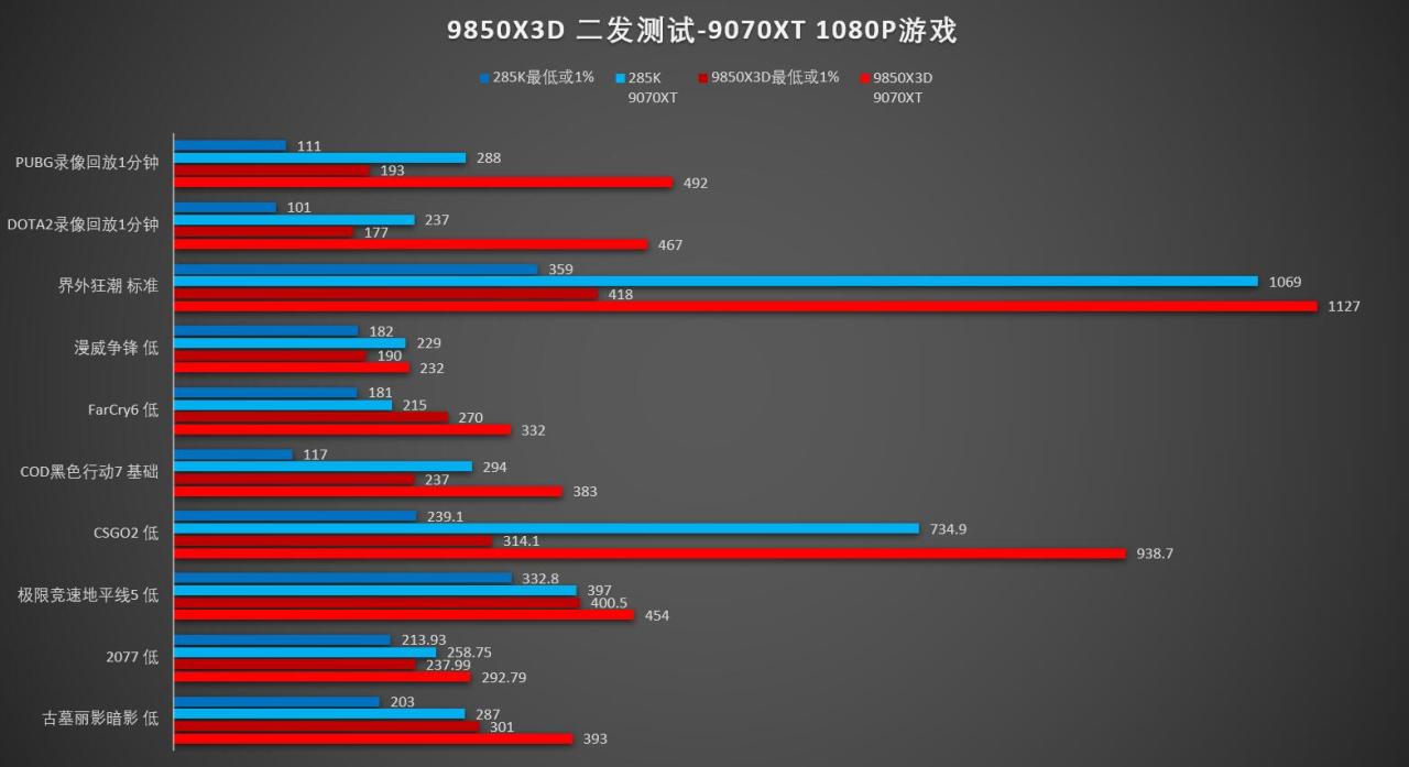 而到了1080P分辨率下,这一差距被再次拉大了,9850X3D PBO下能够领先285K大约35%之多,而不开的数据是31%,总算是有点比较明显的差距了: