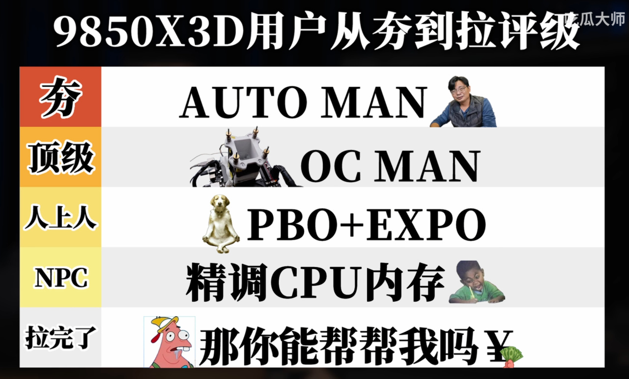 这里就不上图了,简单说一下吧:开启了PBO之后,整机输入功耗从220W提升到了260W左右,CPU功耗从120W提升到了150W左右,也就是说,用30-40W的功耗,换来了2-4%的性能提升......借用B站UP吃瓜大师的分级,至少在9850X3D这个产品上,是这样的: