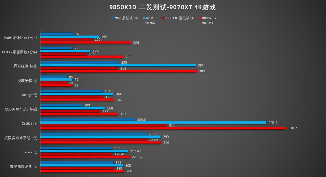 前几天锐龙R7 9850X3D已经正式解禁了,之前的测试也发布了。不过首发测试时间有限,用的是旗舰卡RTX5090,主要还是对比9850X3D在目前的条件下性能提升有多少,而且很多测试也没有时间测,这次首发过了,换成更加主流一点的RX9070XT显卡,以及为9850X3D开启PBO超频,并且对比的是低画质下的游戏帧率,看看”电竞画质”下性能差多少!