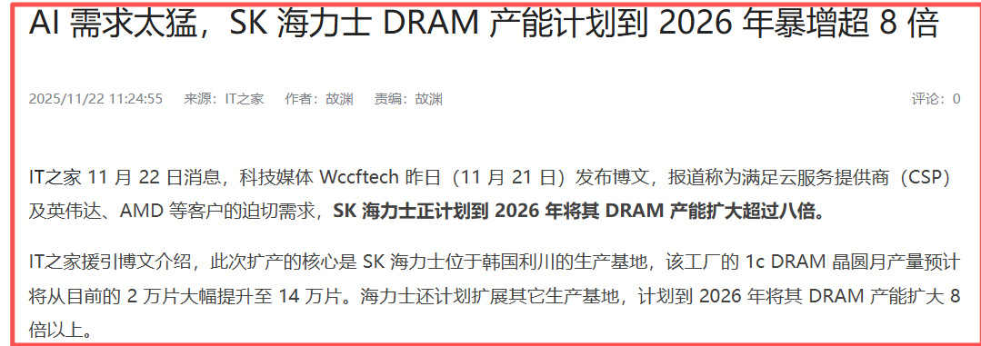 目前關於DRAM擴產的消息,主要是這條——海力士計劃在今年擴大8倍產能:
