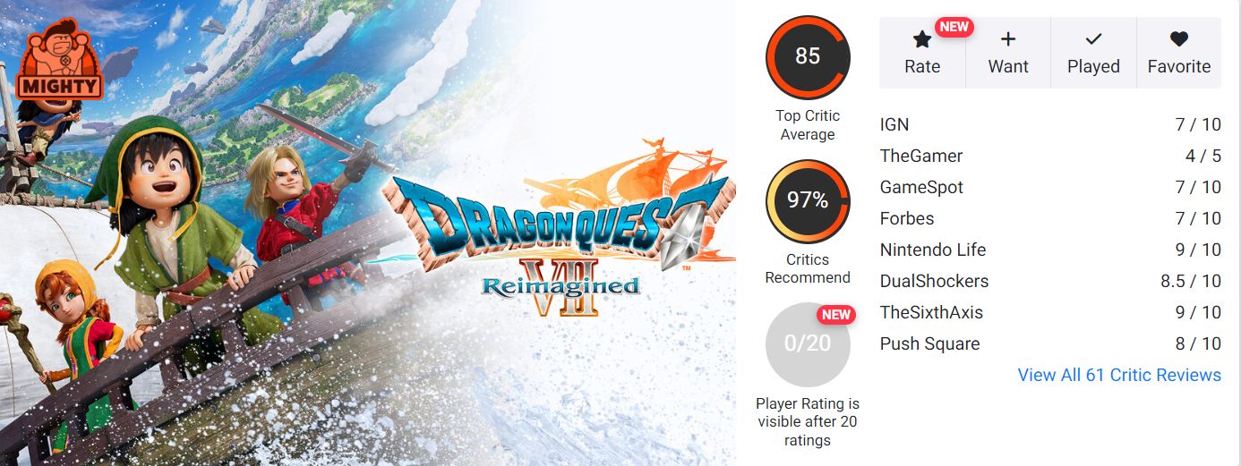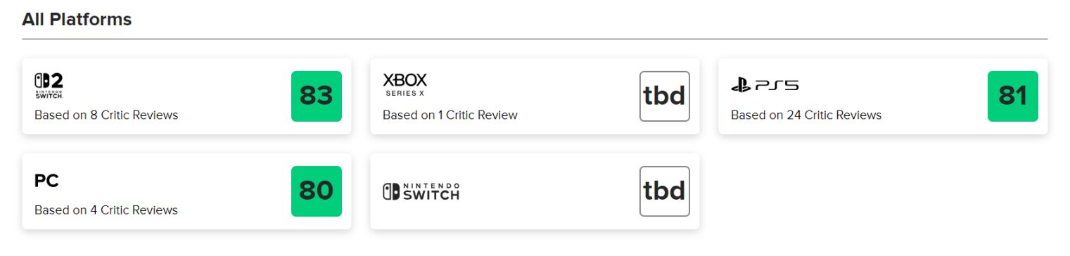 Metacritic(PS5端收錄24家媒體評分,Metascore81分;Switch 2端收錄8家媒體評分,Metascore83分;PC端收錄4家媒體評分,Metascore80分)