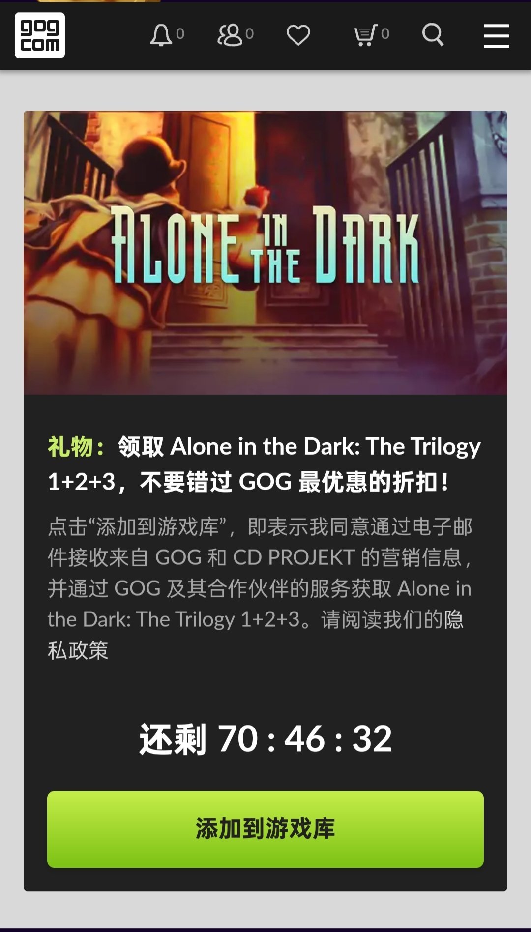 遊戲領取方法依然是進入gog官網往下拉,就會看到了,點擊添加到遊戲庫就可以免費領取了