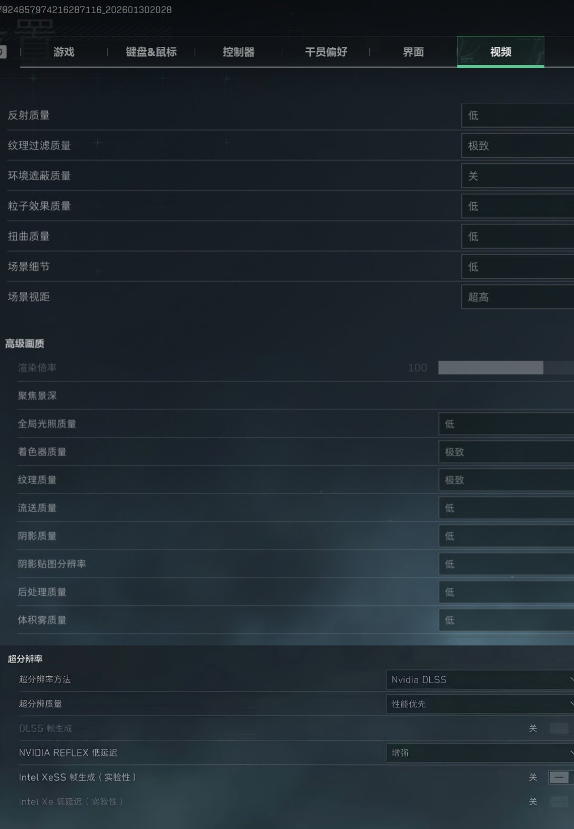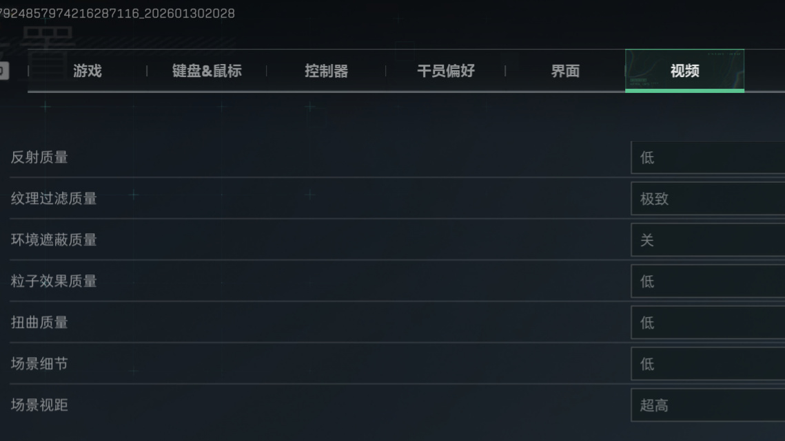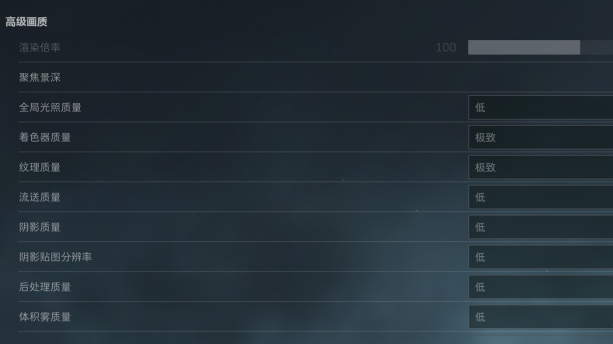 其次,高級光照與性能設置上,全局光照、體積霧質量及動畫質量等項目可設置爲“低”以節省資源。着色器質量建議設爲“高 - 極致”,以提升遊戲內整體貼圖與角色紋理的清晰度。陰影相關設置(陰影質量與陰影貼圖分辨率)對性能消耗較高,而且意義不大,可設爲“低”。流送質量我選擇“低”,因爲能祛除一些擋視野的障礙物。(比如之前水壩樓下大保險旁邊的那塊幕布,我想很多玩家都知道)