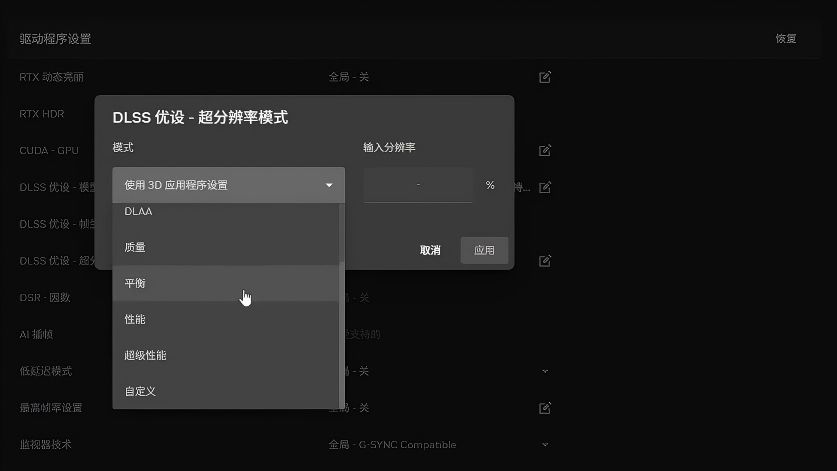 在選定模型後,可根據個人偏好設置 DLSS 超分辨率模式:注重畫質可選“質量”,追求幀率則選“性能”;若此前未調整過設置,默認選項通常已足夠。