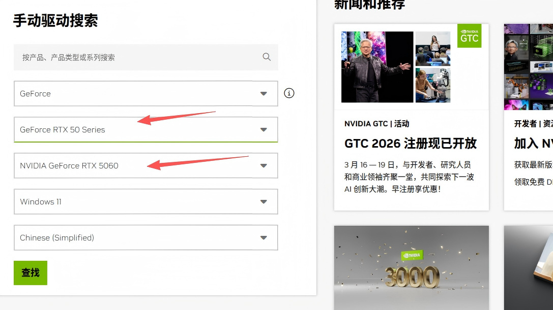 首先來說說英偉達的模型選擇。大家都知道英偉達在不久前也是更新了 DLSS 4.5,新增了 M 模型和 L 模型,使用新模型必須要更新到最新驅動,可以前往網站:https://www.nvidia.cn/drivers/lookup/,選擇你的顯卡,然後下載驅動。
