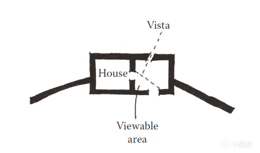 圖 7.6 克里斯托弗·亞歷山大所描述的僧侶住所示意圖。庭院石牆上的窗口控制了居住者對外部景觀的視野。這種對廣闊視野的刻意“剝奪”,反而使那一瞬間、有限的觀景體驗更加令人滿足與珍貴。