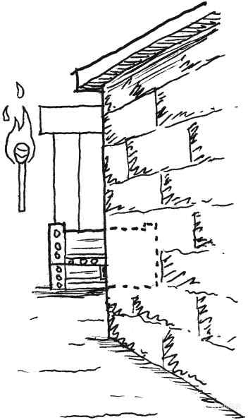 在房屋前方,有一個被厚重石牆圍起的庭院。走向房屋時,人需要穿過一道門進入庭院,再斜穿庭院來到房屋正門。在庭院另一側的石牆上,有一道狹窄而傾斜的縫隙,貫穿了整面厚牆。當人穿過庭院時,在某一個瞬間、當人的位置恰好與牆上的縫隙對齊時,能夠短暫地看到大海。隨後這一視野立刻消失,人便繼續前行,進入屋內。¹⁶