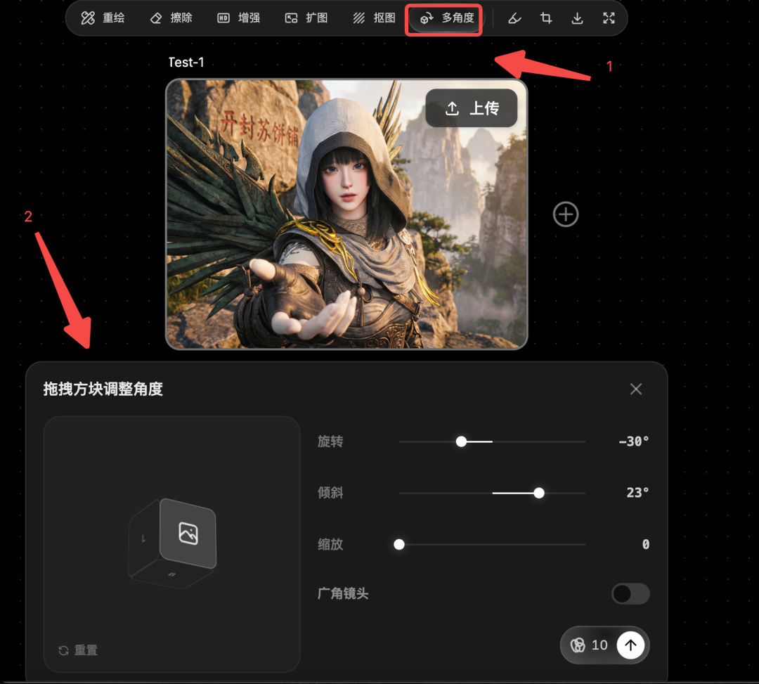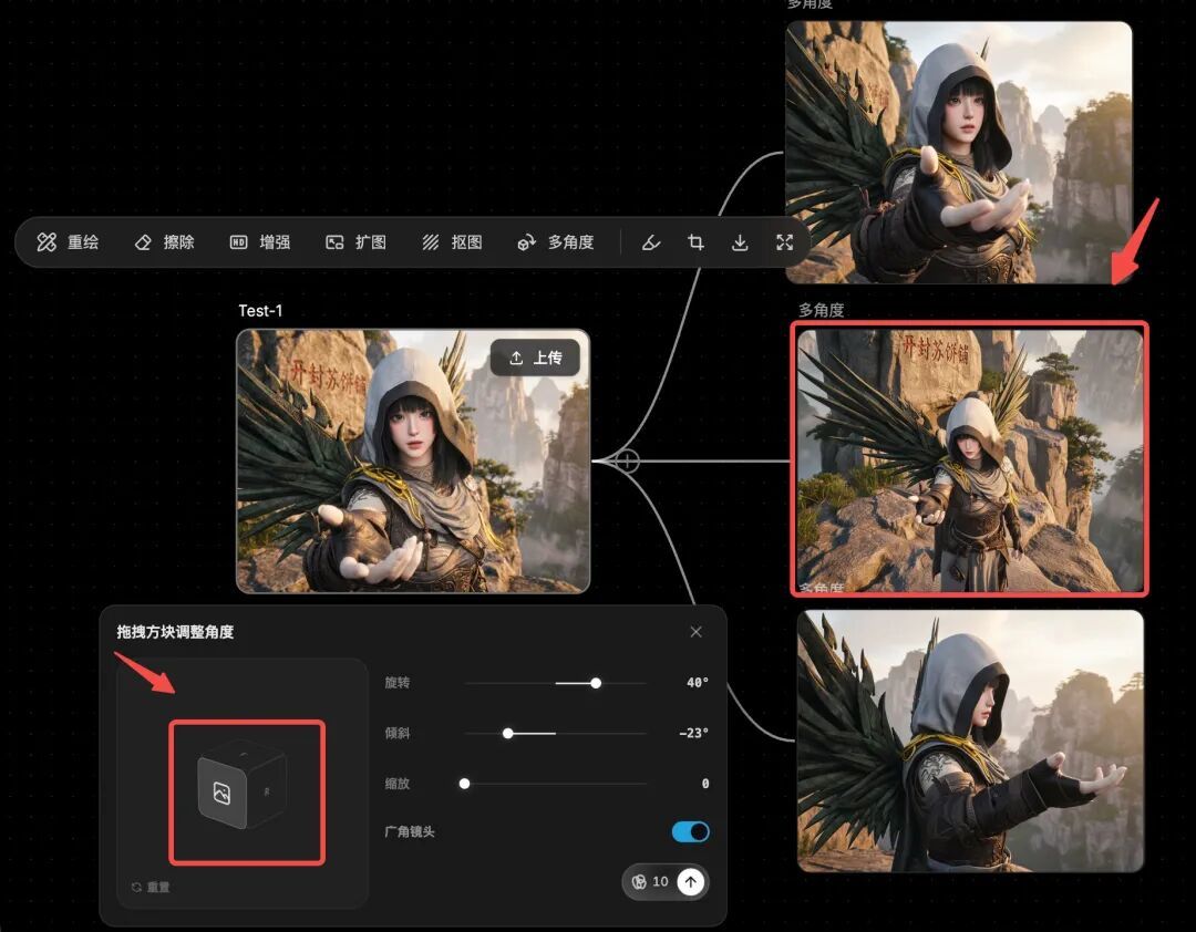 指定生成畫面的鏡頭機位與人物朝向,精確控制人物的拍攝角度。現在已經生成好了,一致性極強,只需要拖動攝影機角度,即可生成。