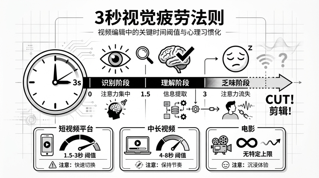 3. 乏味階段 (> 3秒): 如果畫面是靜止的,且觀衆已經提取完了所有視覺信息,大腦就會發出信號:“這裏沒有新東西了,下一個”。無聊感由此產生。
