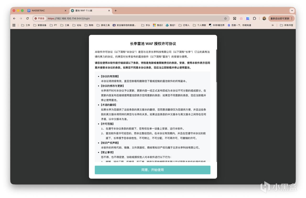 部署完畢後,瀏覽器輸入NAS_IP:9443即可訪問服務。點擊「同意並開始使用」。