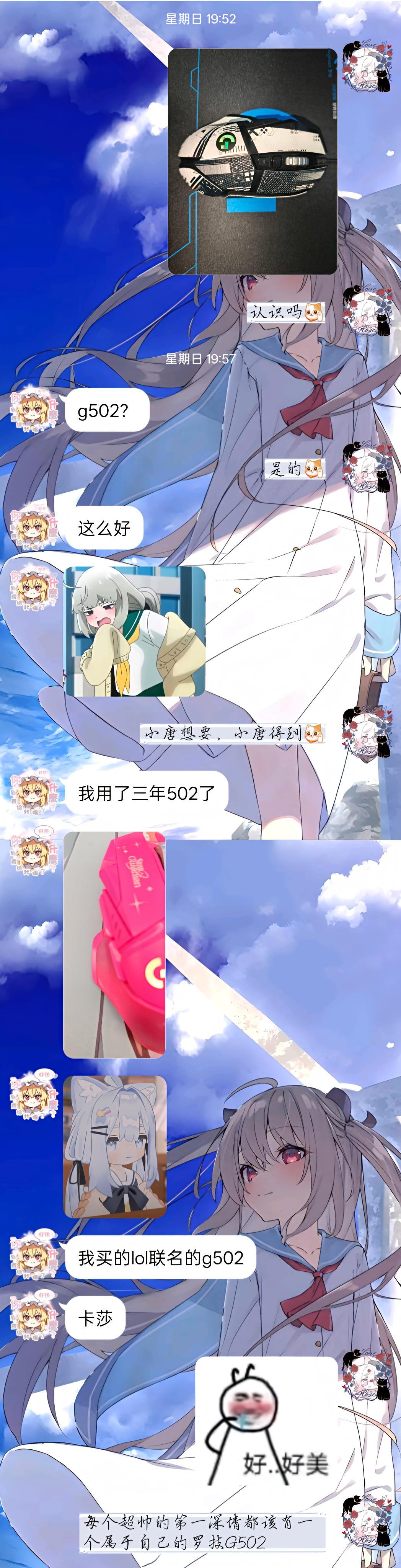 不过这期间有个小故事,我有一个朋友,她的G502是卡莎的联名款,我当时不知道,跑过去跟他炫耀,顺便问点鼠标的问题,结果人家直接甩我这个东西,我牙都咬碎了。