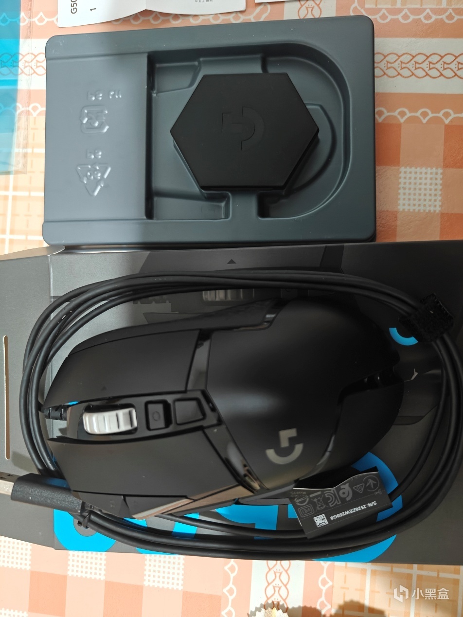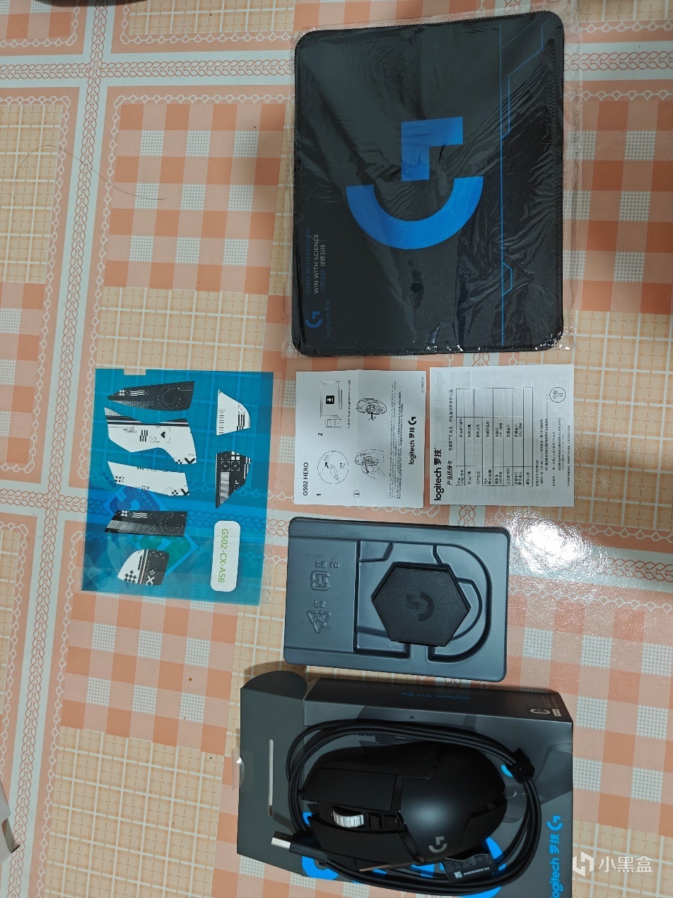 依旧是标有G502和鼠标样式的盒子,里面的东西包括:G502鼠标、说明书和保修卡、18g配重块、鼠标防滑贴、鼠标垫。(补充一下,我买的是有线的鼠标)