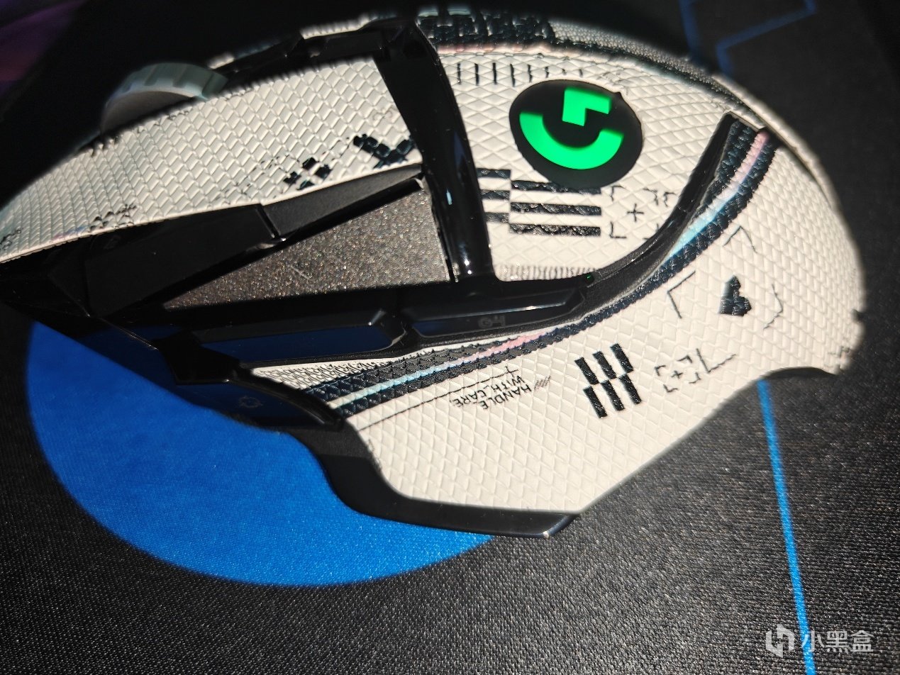 随后就是贴纸,我买的是这种留一点点印花的黑白切的防滑膜。他也有纯黑的,纯白的,或者比较奇特一些的,但我觉得黑白切是最突出“科技感”这个命题的配色,再加上淡淡的印花样式,直接把原本的黑鼠标拉高好几个档次!再把最后贴纸中间的G漏出来。真的,太酷了!