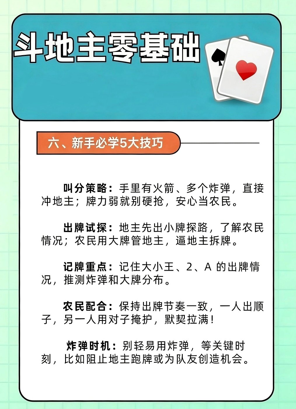 同时会讲解新手最实用的出牌思路、农民配合技巧与地主控场方法,没有复杂术语,全是通俗易懂的实操要点。不管是从未接触过的纯新手,还是规则模糊的入门玩家,跟着图文教程一步步学习,快速理清玩法逻辑,告别盲目出牌,轻松掌握斗地主的基础玩法,快速上手开启对局。