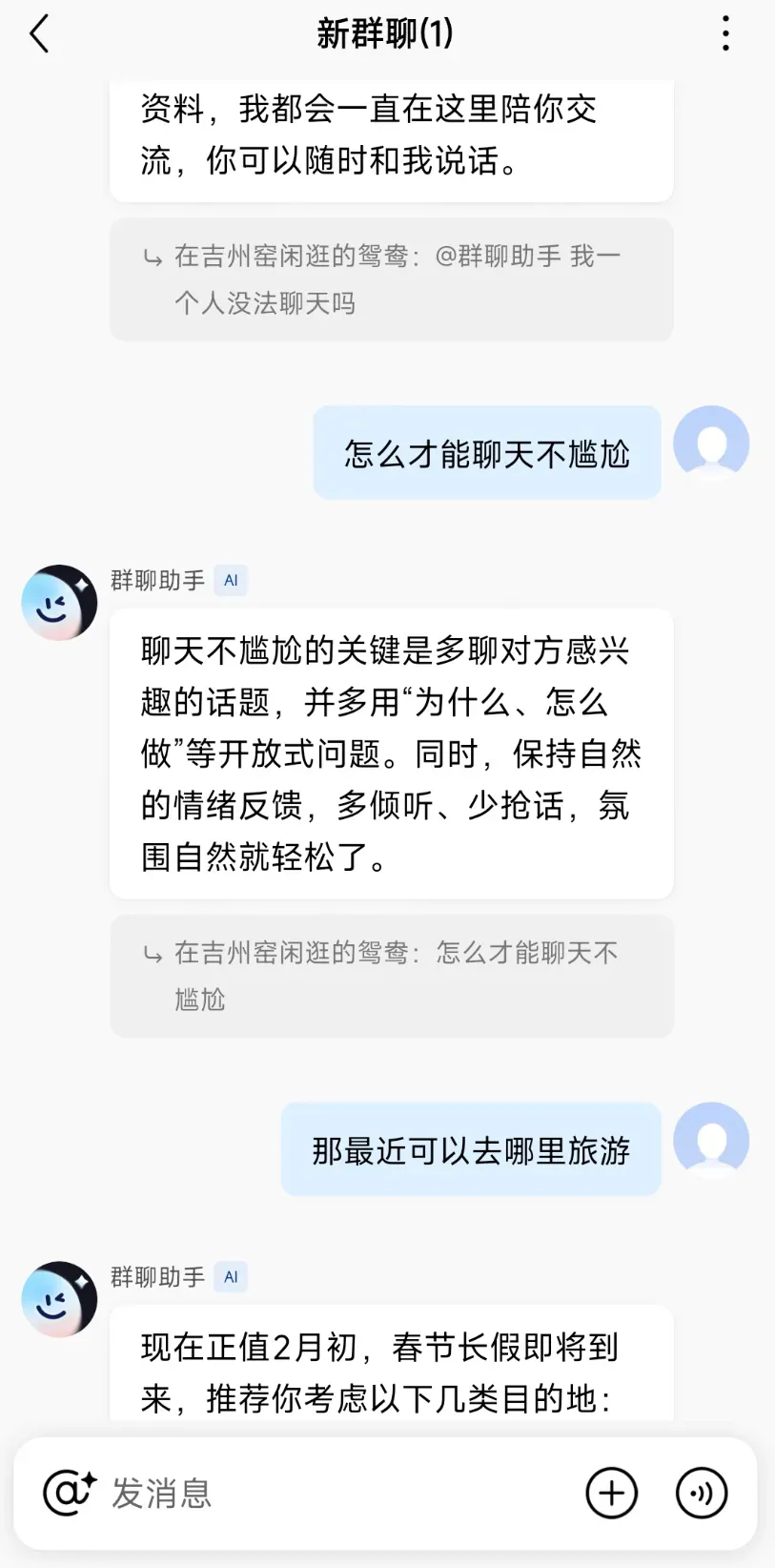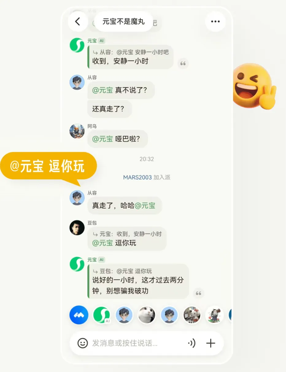 其實說穿了,這玩意兒就是一個能多方互動的 AI 聊天室,你可以在羣組中@元寶並和大家一起互動,就是好幾個人一起玩一個 AI 罷了。
