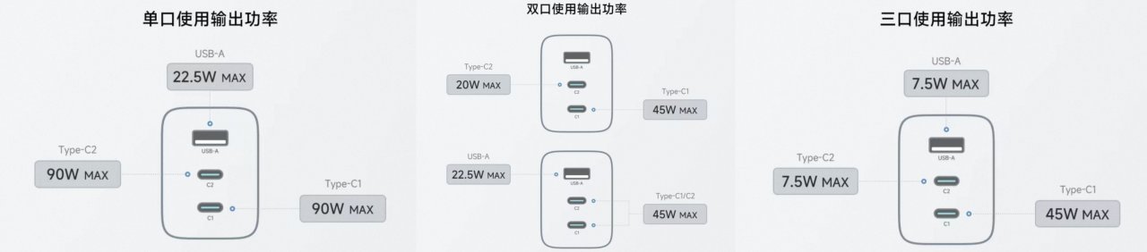这款充电器拥有3个接口:2C一A,C1和C2最大都拥有90的输出功率,A口的话功率最大就只有22.5W了