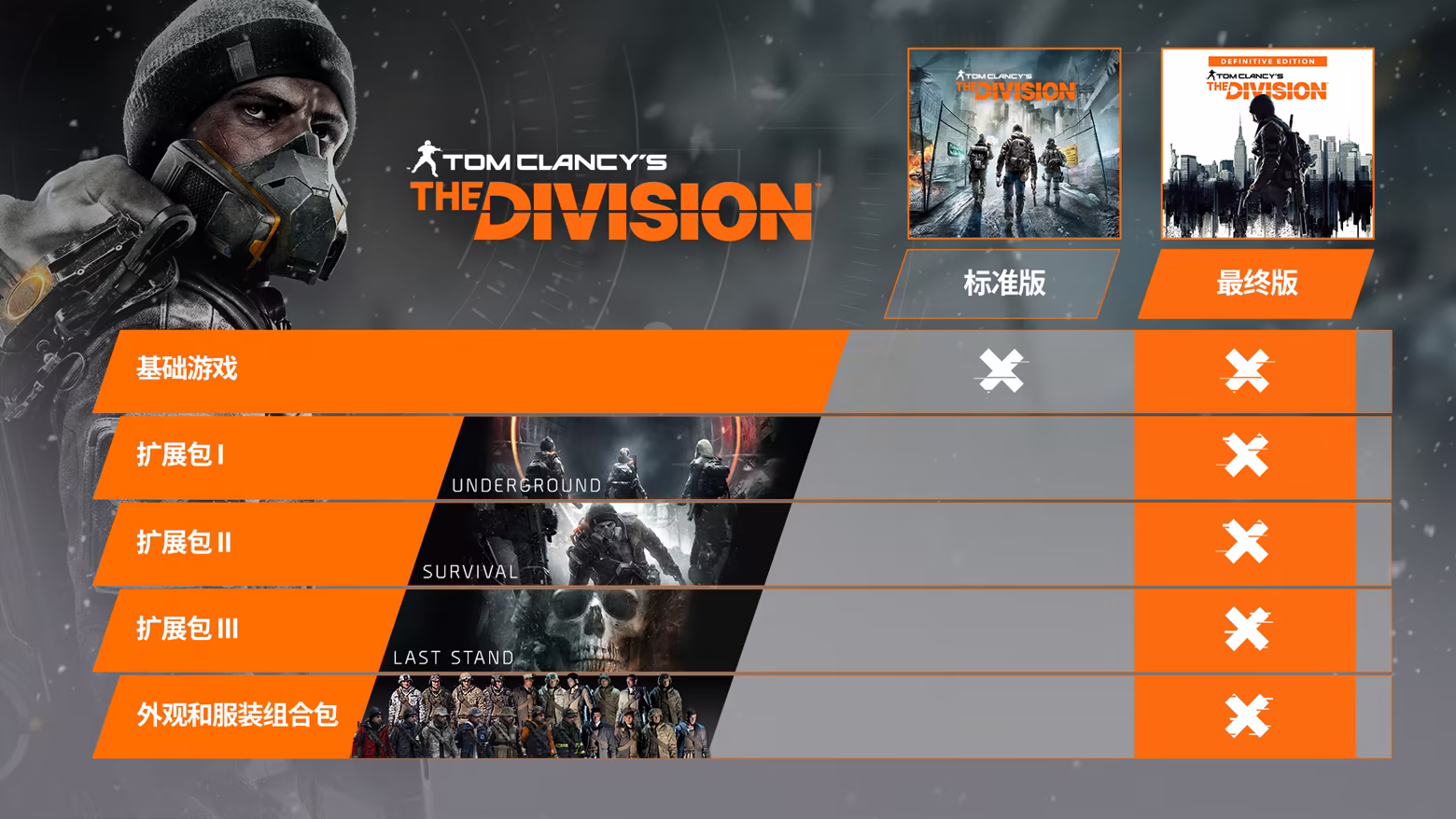 在此最终版游戏中,获得完整的《全境封锁》体验!基础游戏,所有三个季票扩展包,还有多个外观组合包等着你。