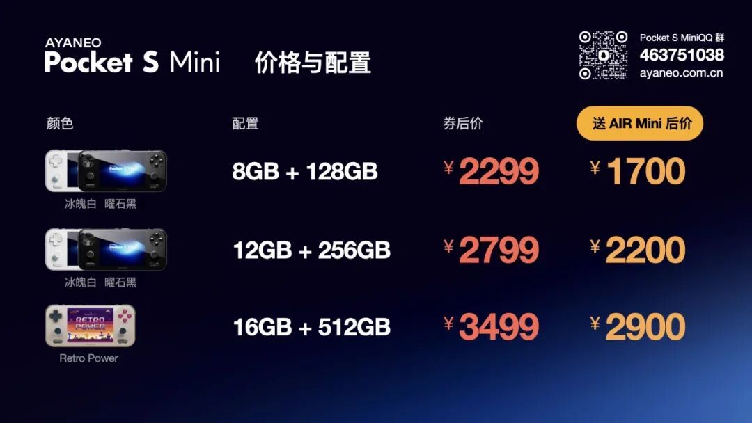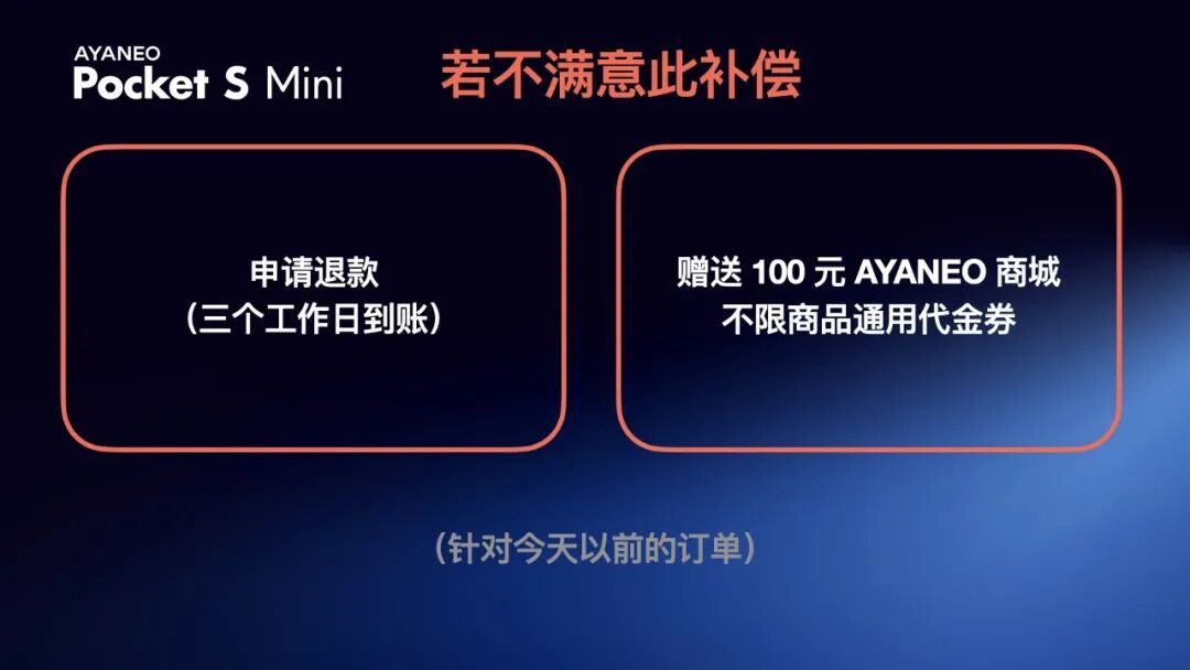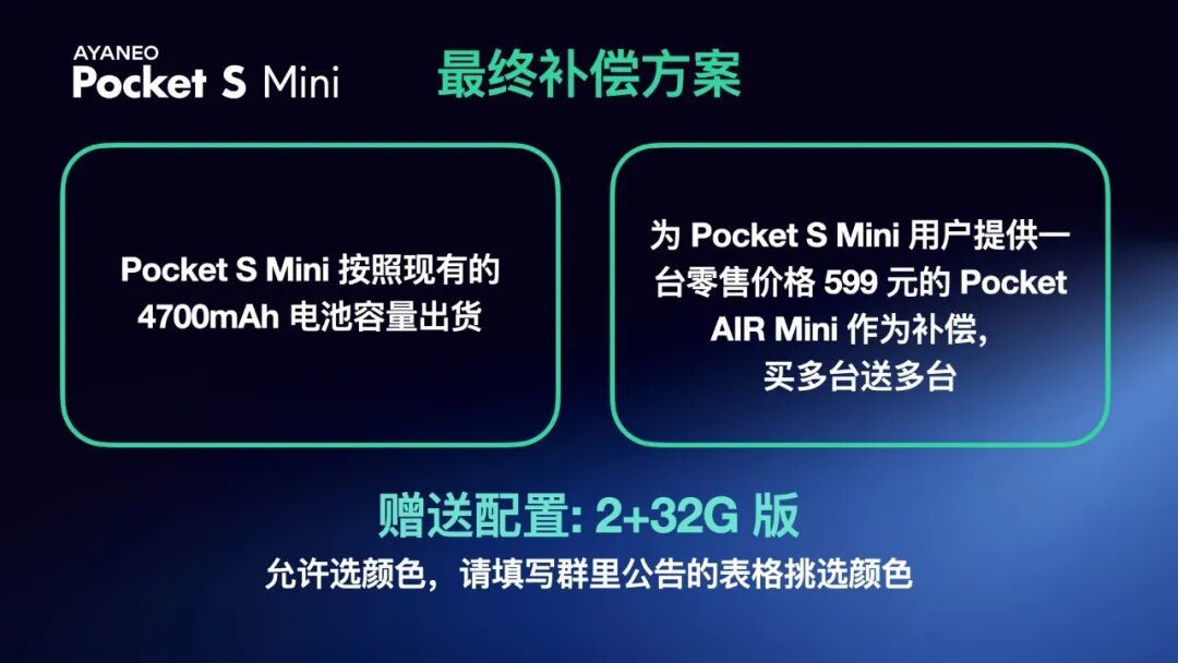 1. 继续保留Pocket S Mini订单的用户,可免费获赠一台零售价599元的Pocket AIR Mini掌机(2GB+32GB版本),支持选择机身颜色,补100元可升级至3GB+64GB版本,多台订单对应多份补偿;