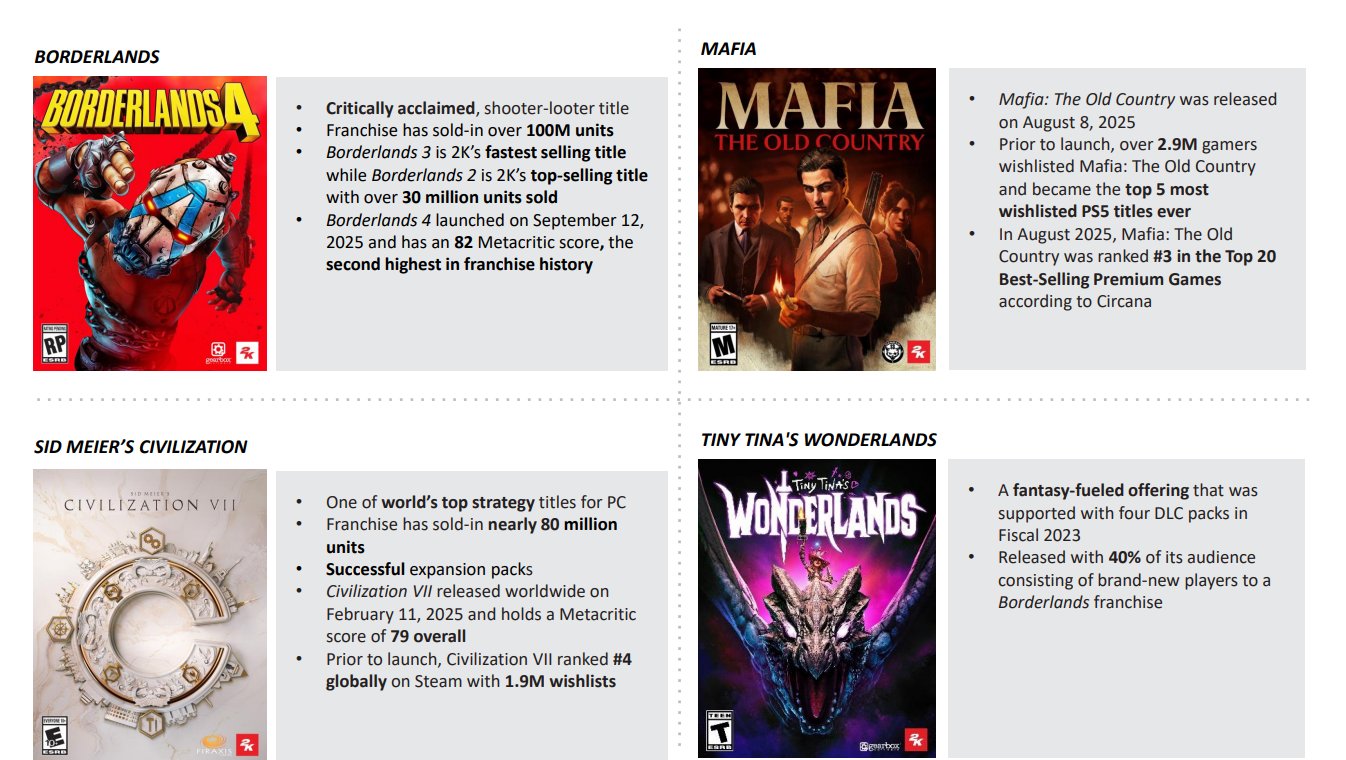 此外,Take-Two 2026財年第三季度財報出爐,以下爲遊戲單作或系列銷量數據:
