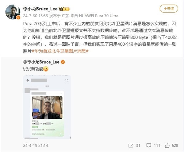 值得注意的是,华为在2024年发布的Pura 70系列就率先独家实现了北斗卫星图片消息,不仅支持发送文字、地理位置,还能发送图片信息。