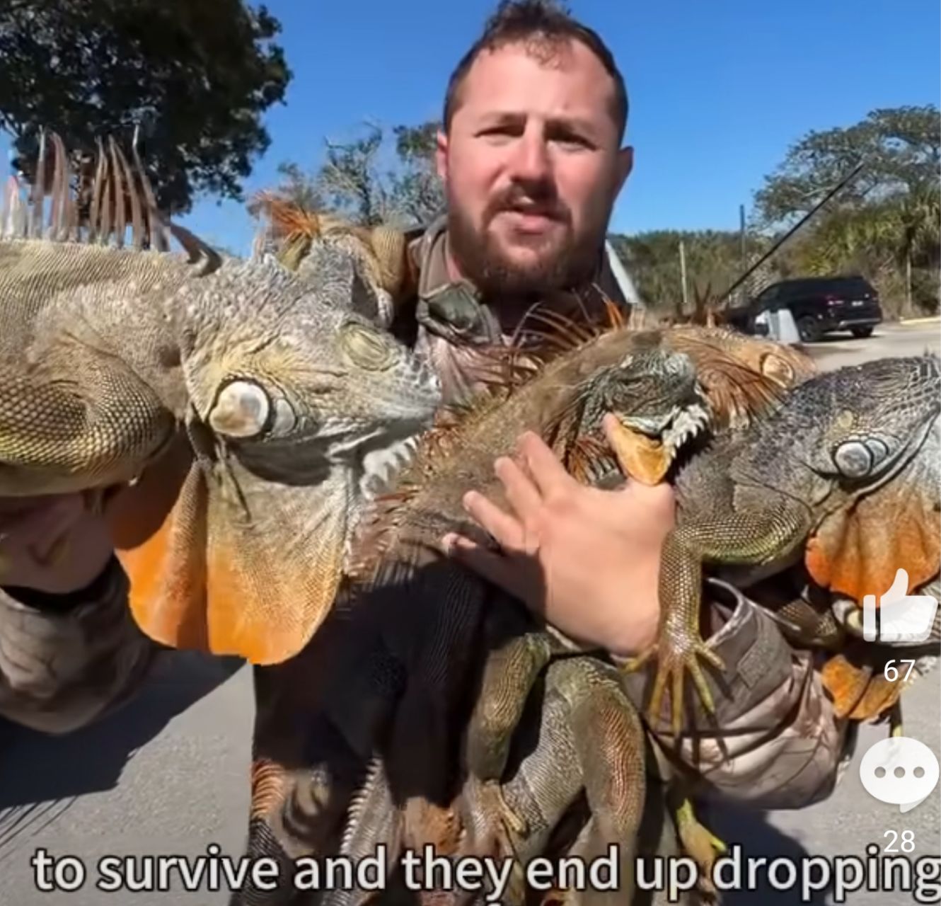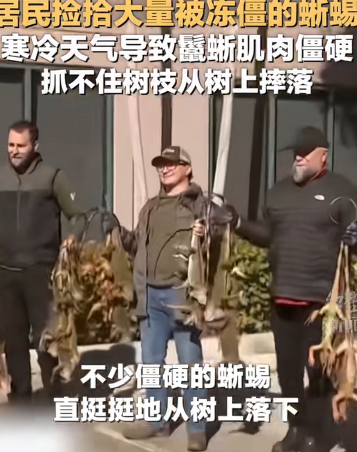 大批绿鬣蜥直接冻僵从树上掉线,主打一个高空“坠蜥”名场面,冷血的它一遇低温就秒变木头,回暖还能复活,当地急喊别乱碰,捕手两天薅走2500只,寒潮专治入侵物种!