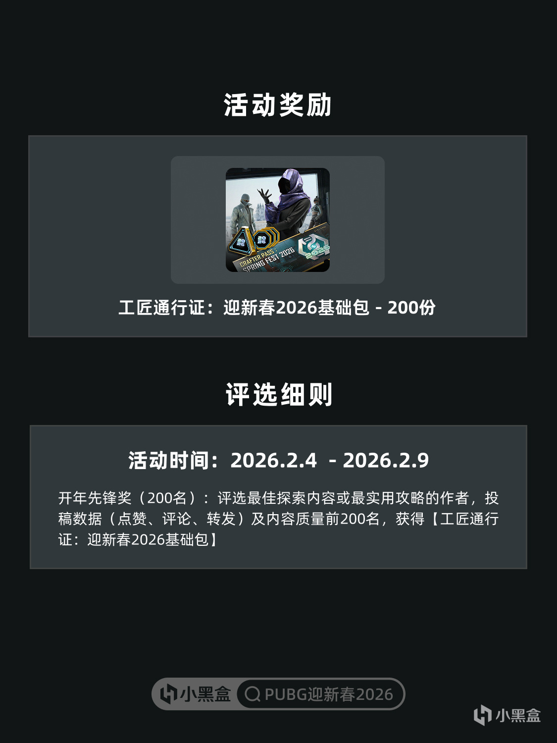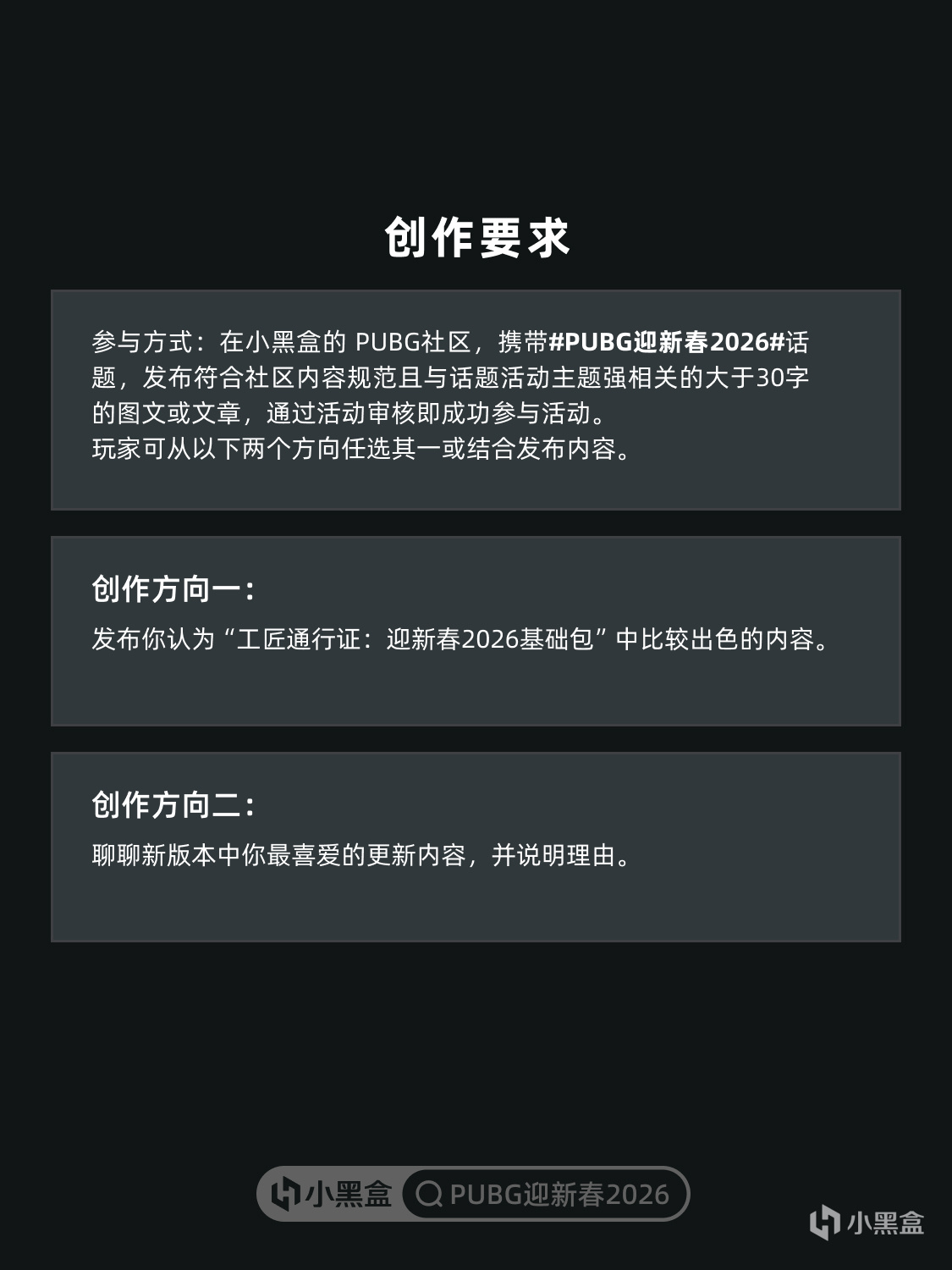 在小黑盒的PUBG社區,攜帶 #PUBG迎新春2026# 話題,發佈符合社區內容規範且與話題活動主題強相關的大於30字的圖文或文章,通過活動審覈即成功參與活動。玩家可以從以下兩個方向任選其一或結合發佈內容