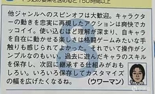 ウワ―マン:8分。超歡迎其他品類的(蒼翼)衍生作。是一款忠實還原了角色們的爽快、帥氣的動作遊戲。角色的可挖掘性很深,看到自己操作的角色像格鬥遊戲那樣自由自在動起來的時候那種手感真好。然而,操作卻很簡單,很好。之前玩過的角色技能可以傳承,在下一次(下潛)過程中可以組合使用很有趣。會想要嘗試各種自定義保存。