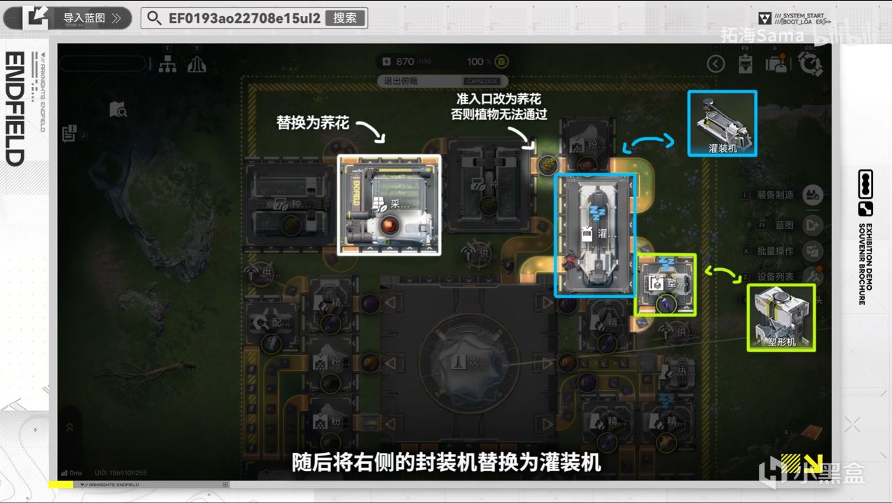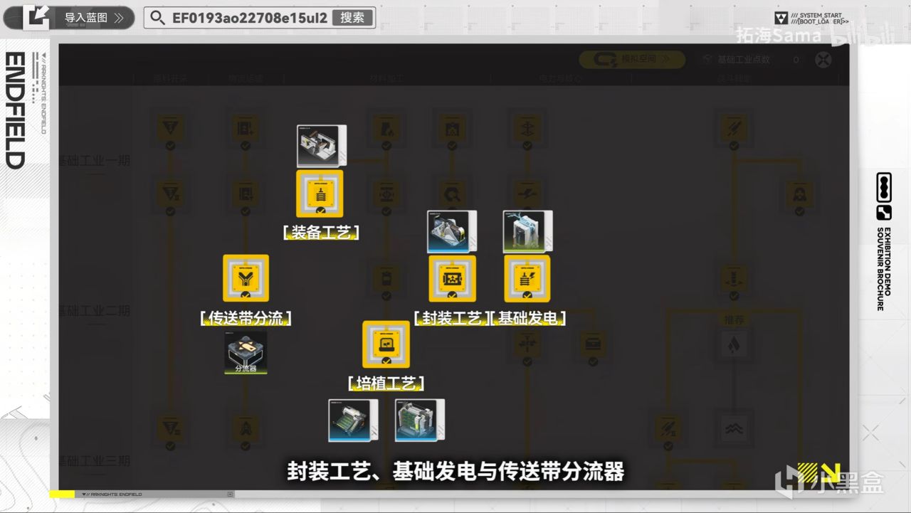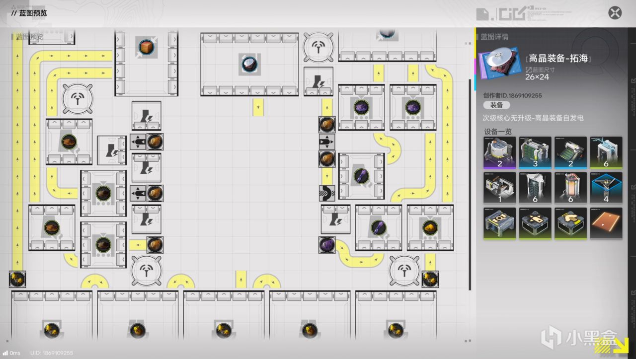 至少需要遊玩到“供能高地”採集到砂葉才能使用。藍圖26x24,位置需嚴格卡牢。工業需一條線解鎖研磨機和傳送帶分流器。高晶裝備藍圖全設施用電共250,這個時候已經是中後期,有主基地的情況下不會缺電,我還在產線上穿插了6個源石發電機,每個發電機發電50電共300電爲產線保底。