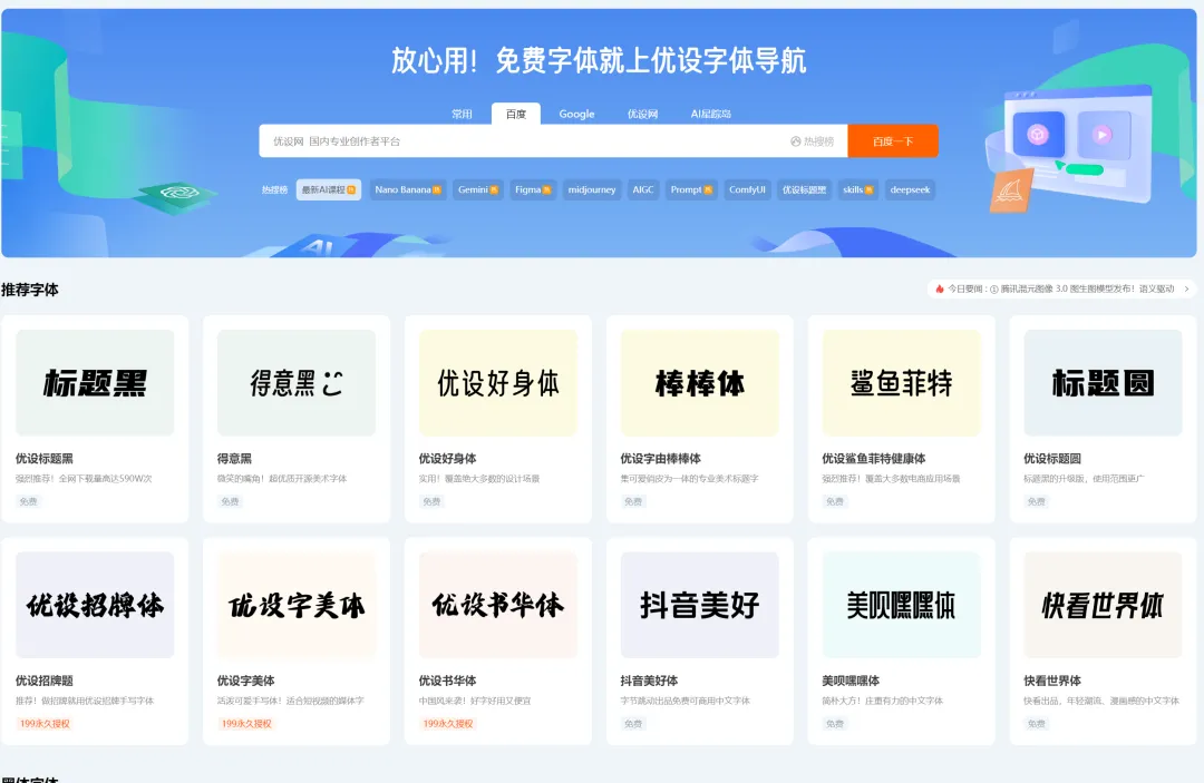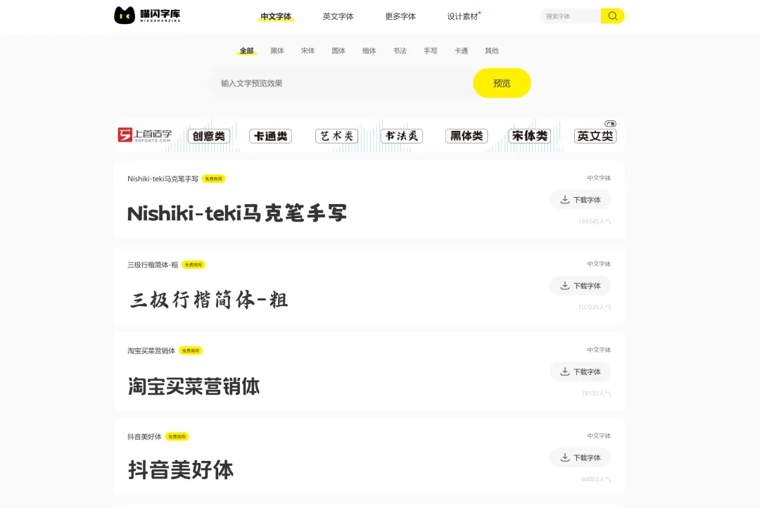 以可愛風、創意風免費商用字體爲主,收錄了大量適合短視頻、社交媒體、文創設計的卡通體、手寫字、藝術字。界面設計活潑友好,搜索功能便捷,支持在線預覽效果。對於需要製作吸睛標題、創意海報的內容創作者是安全又時尚的解決方案。