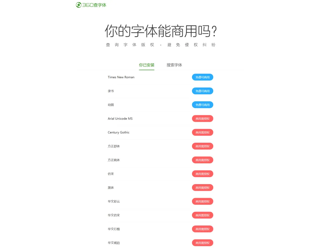 360公司推出的專業版權檢測工具,可一鍵掃描電腦已安裝字體,自動標註"免費商用"和"商用需授權"類別。打開網站後系統自動檢測本地字體,用顏色標識版權狀態:藍色表示可免費商用,紅色提示需購買授權,也支持搜索特定字體查詢版權信息,快速排查風險。