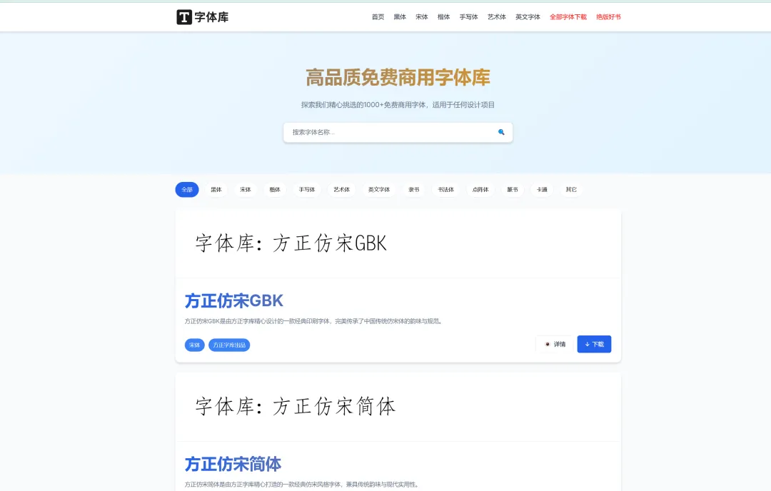 獨立開發者維護的精品字體聚合站,以"小而美"著稱。網站不僅提供字體下載,更注重字體文化的傳播,每款字體都配有詳細的設計背景介紹和授權說明。資源分類清晰,包含創意、書法、像素等特色品類,同時提供在線試寫功能,是構建個人字體庫的優雅選擇。