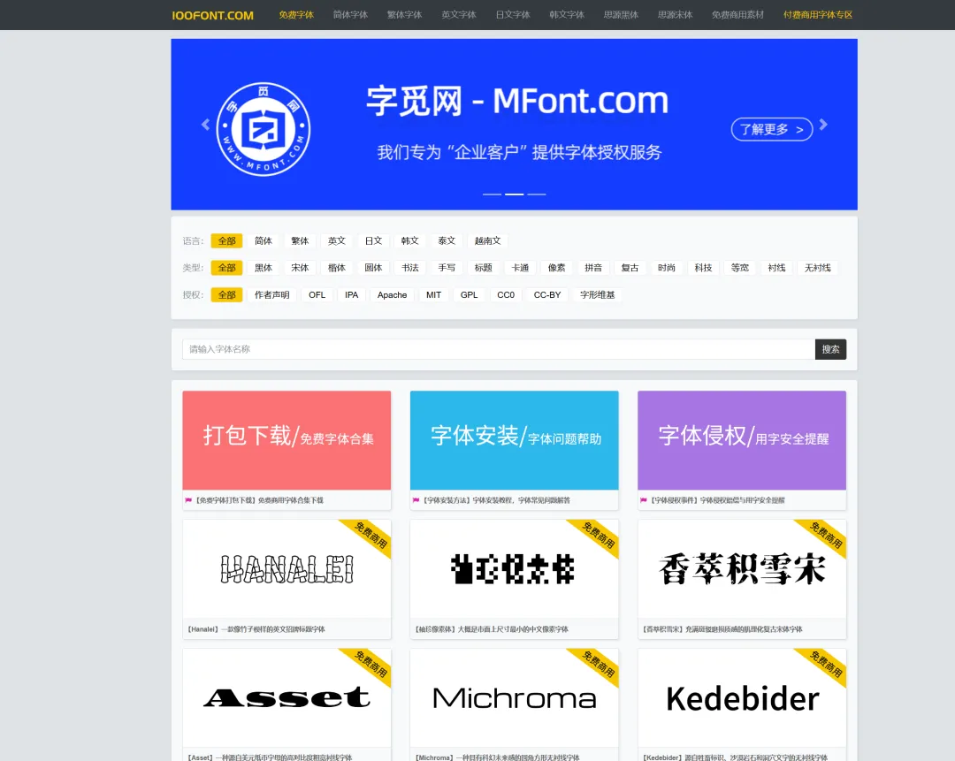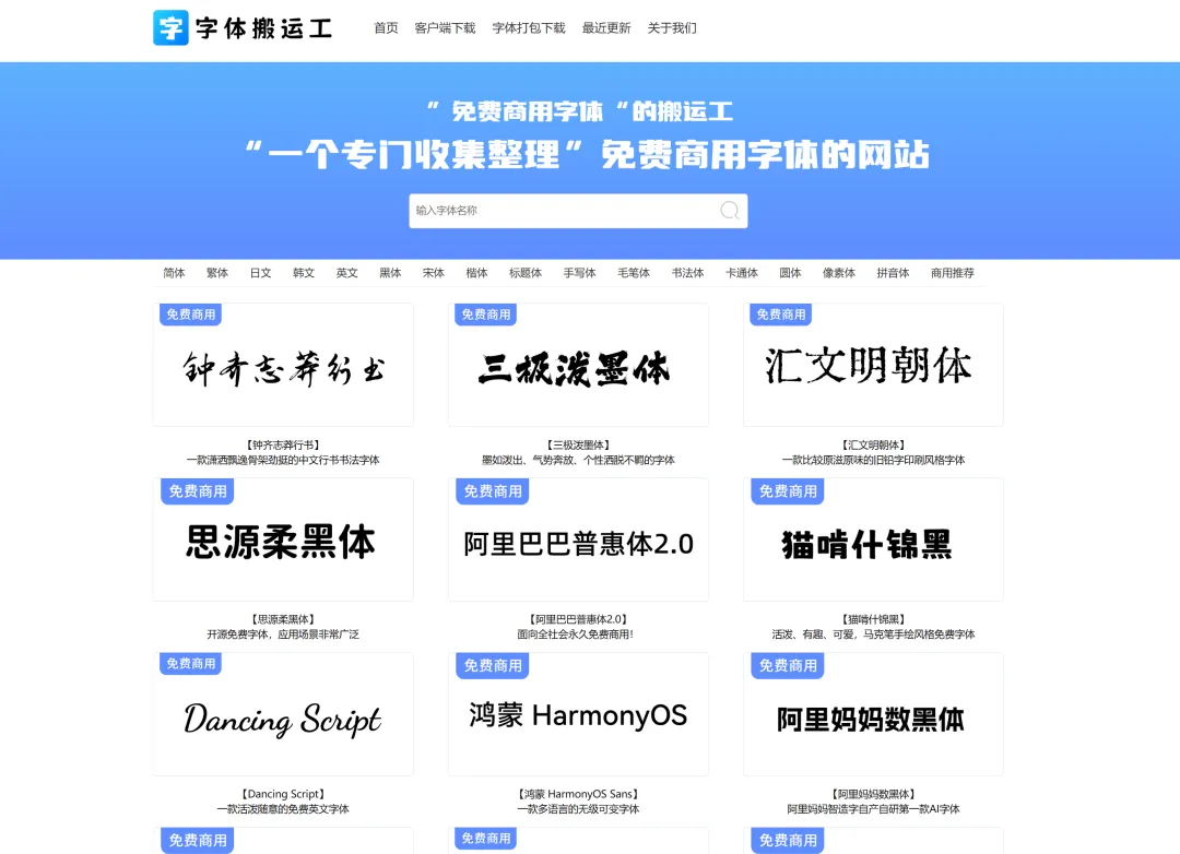 收錄超過1000款可商用字體,涵蓋簡體、繁體、英文等多種語言類型,支持按風格、用途、字符集等多維度篩選,可用夸克網盤批量下載。平臺還會定期更新字體資源,確保收錄最新發布的免費商用字體,在商業項目中合法使用,規避版權糾紛風險。