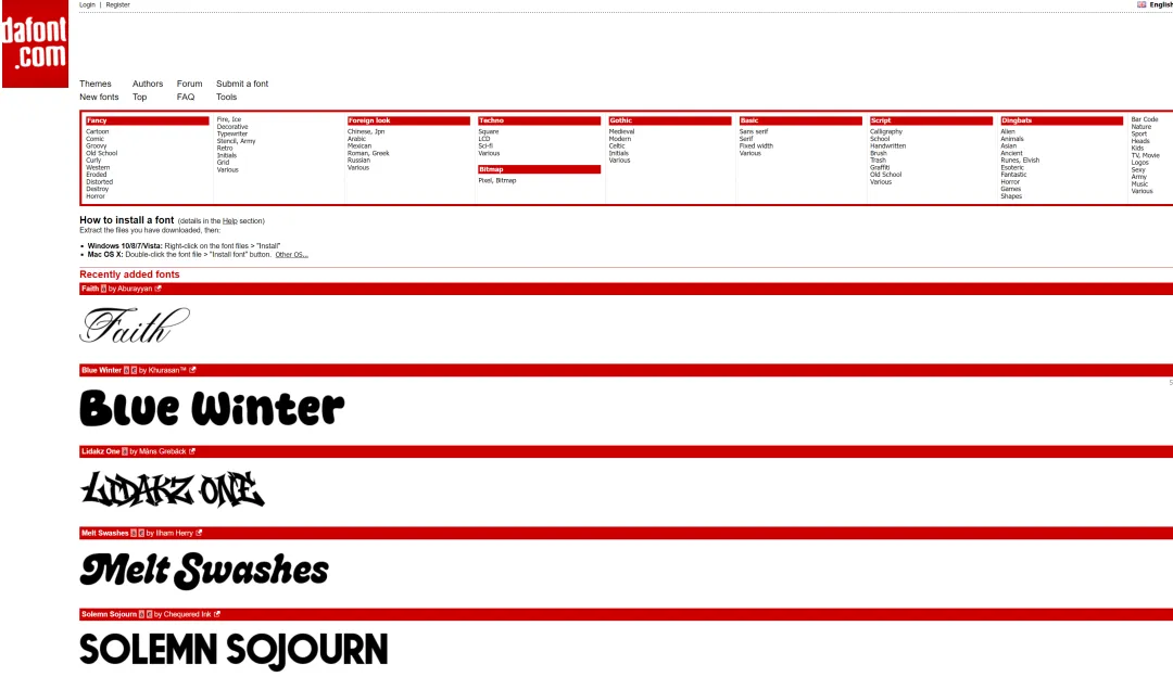 老牌免費字體分享社區,收錄超過4萬款字體,風格從經典到創意應有盡有,雖然以英文字體爲主,但也不乏設計師自制的創意中文字體。適合尋找節日海報、遊戲界面等特殊場景的字體。需注意部分字體僅限個人使用,商用需單獨授權。