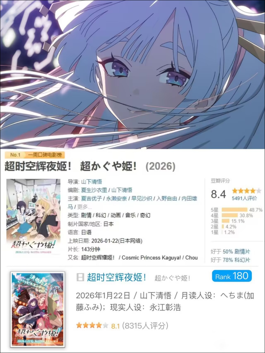 如果你現在還沒來得及看,這部可以競爭年度最佳的劇場版,那可以先去瞅瞅它的評分。在相對大衆的豆瓣,以及更加ACG一點的BGM,《超時空輝夜姬》的評分分別是8.4與8.1,這是一個很誇張的分數。