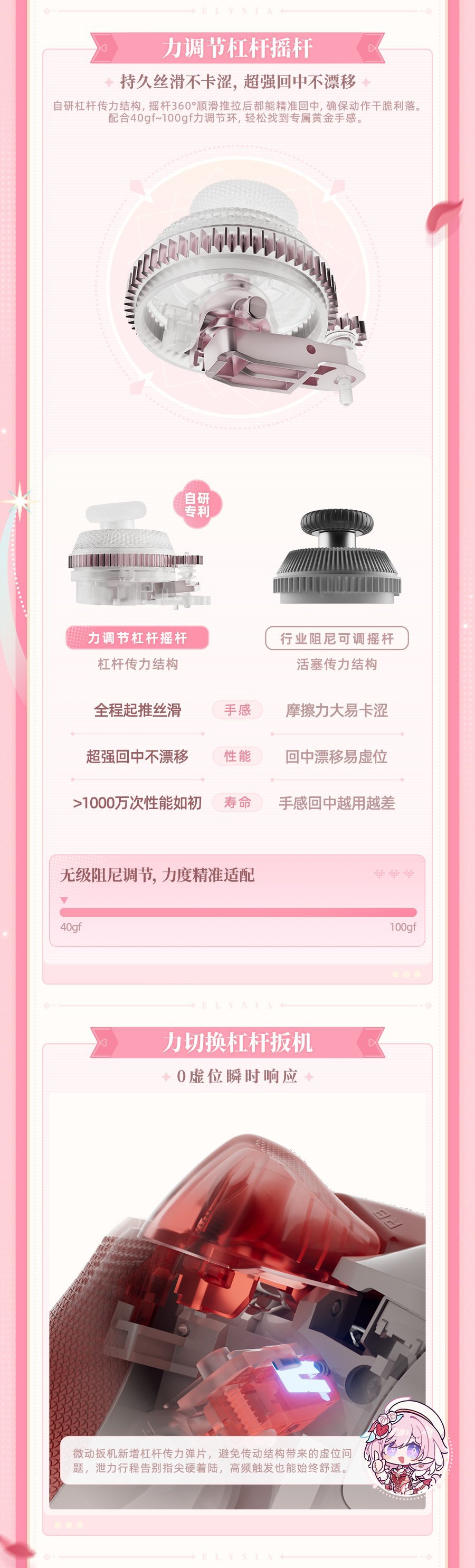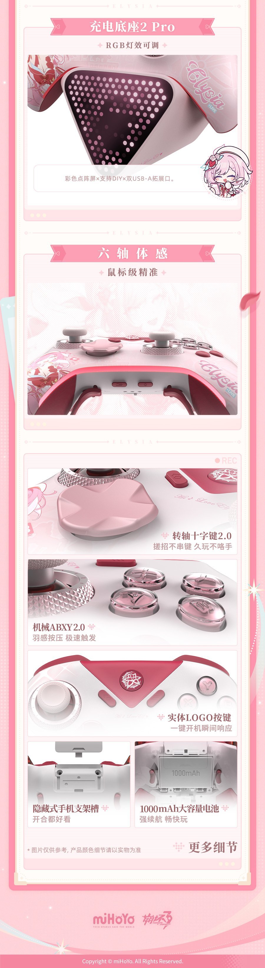 手柄搭载全链路低延迟、超频性能,配备力调节杠杆摇杆,握把贴合角色形象为精英包胶材质,充电底座支持彩色点阵屏DIY、RGB灯效调节。