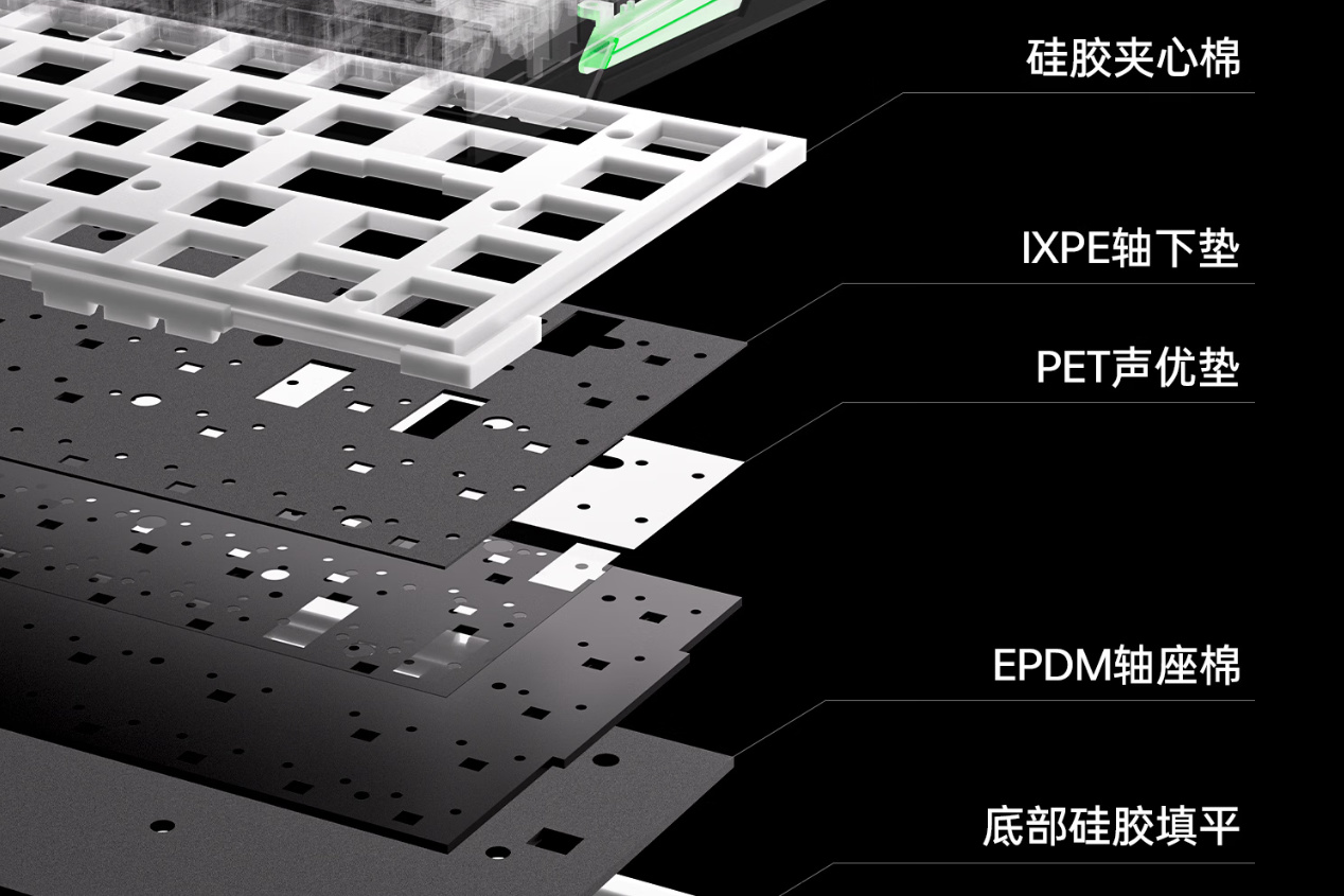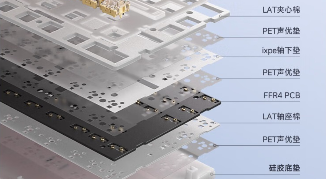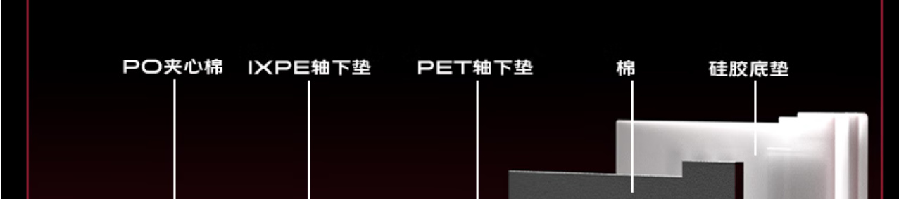 填充方面給的很足,一共給到Poron夾心棉+8倍發泡軸下墊+PET墊+EPDM底棉和PET絕緣墊五層,看着層數沒啥優勢,但都做了針對性優化,和常規的有些不同。