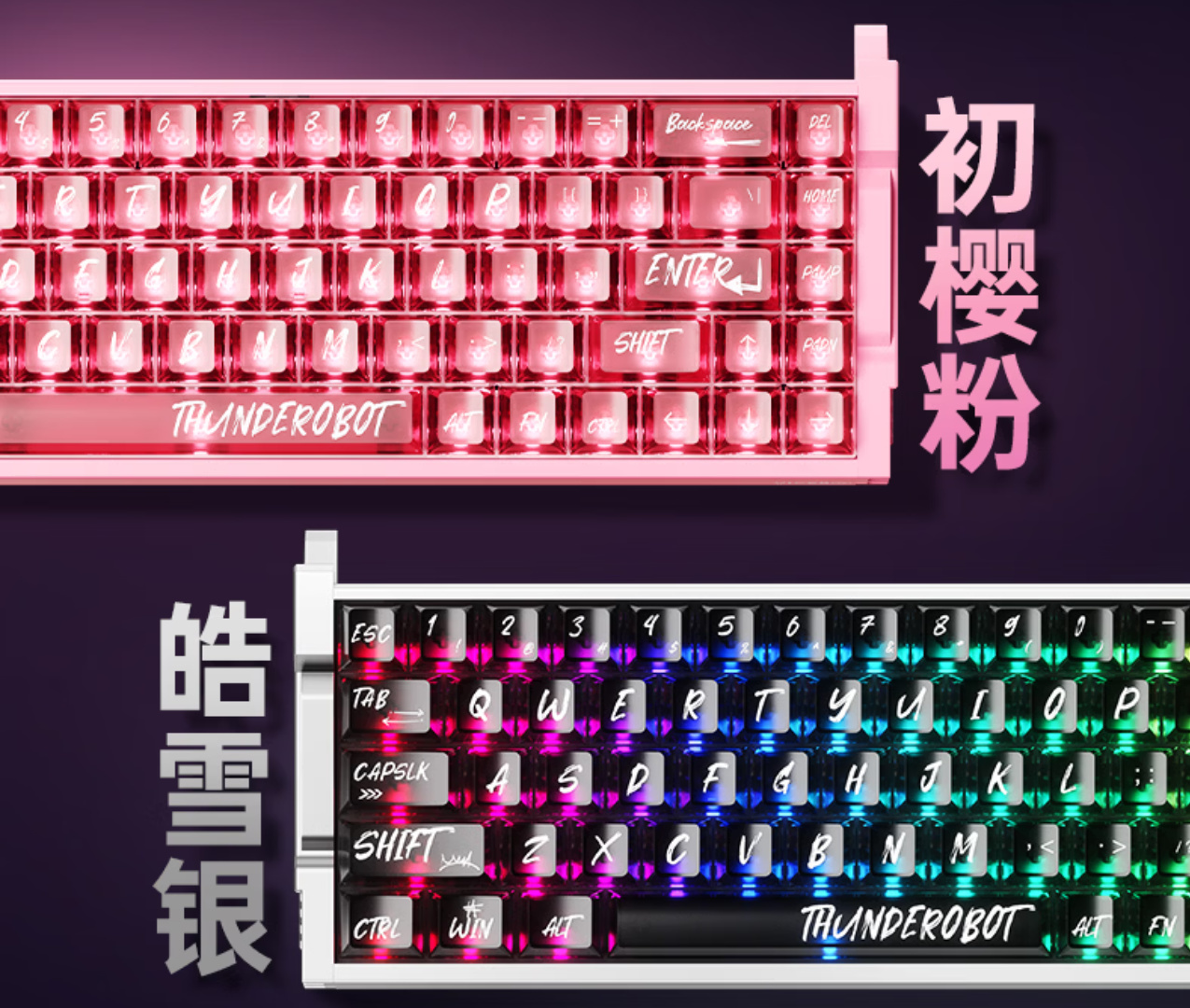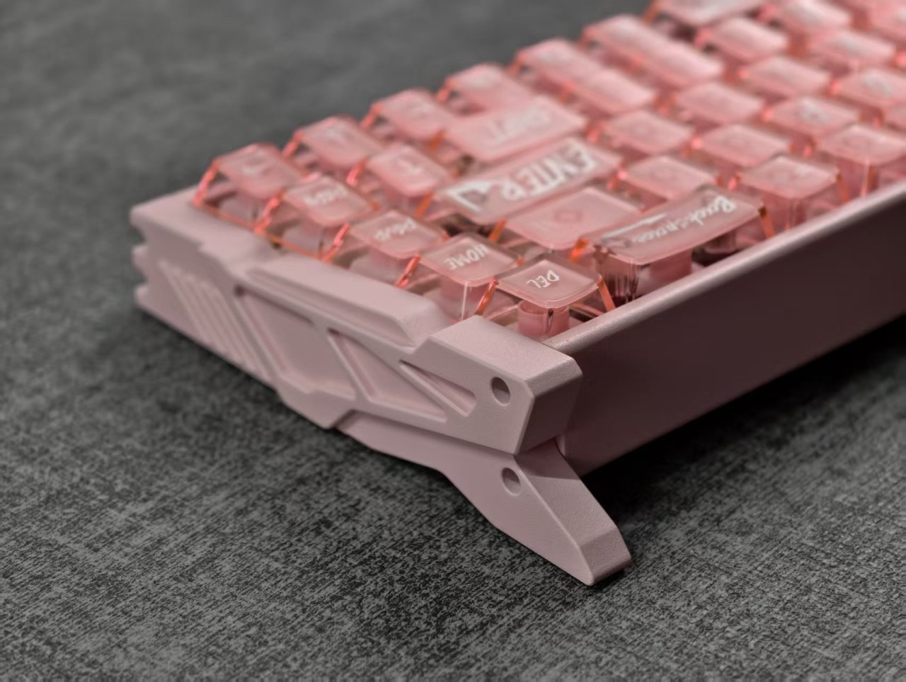 鋁合金殼體,表面採用噴砂或180目氧化工藝,質感沒毛病,給到初櫻粉or皓雪銀兩款配色。鍵帽採用PC霧透材質,並且元素做得很張揚,塗鴉風格的大字體,搭配下位燈,整體效果很棒。