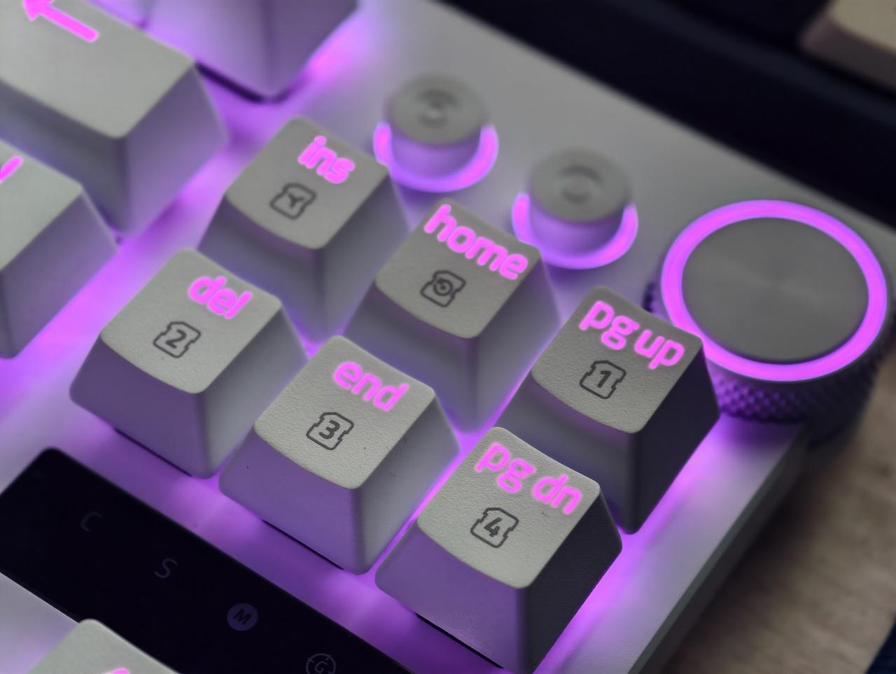 外觀給了四個配色主題,各類點綴設計要比高斯這位大配列元老多到不知道哪裏去,沒有那麼素。鍵盤左右兩側還有獨立燈條,旋鈕做成了臥式的,電源開關也放在鍵盤正面,個性化做得更好