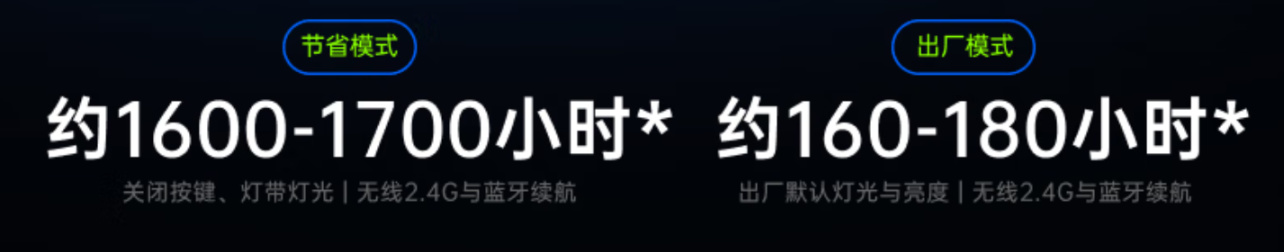 • 10000mAh電池:要知道不少老廠有個壞毛病,就是電源管理做的好就上小電池,想開個RGB都不捨得,畢竟燈珠的功耗可是實打實的。這波10000mAh給的爽快,理論續航1700小時,不開燈預估半年以上續航,開燈也能頂半個月以上。