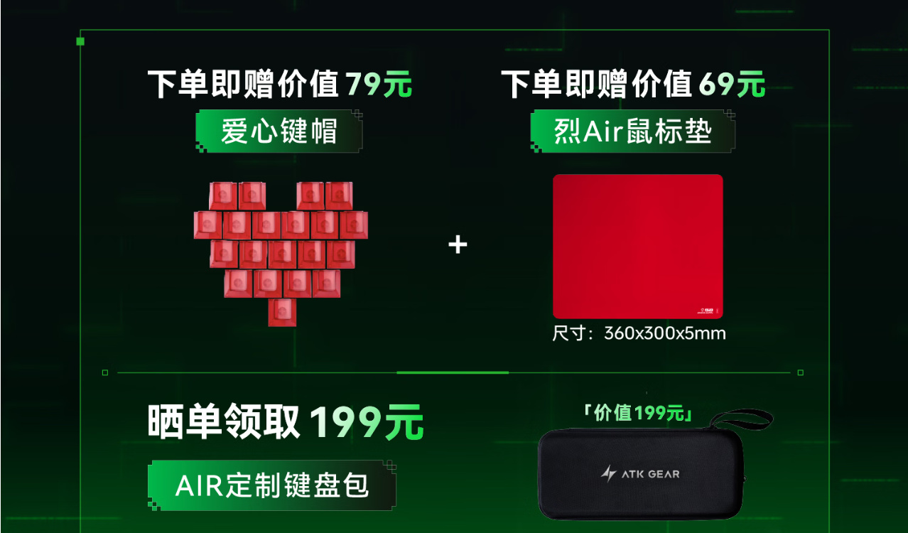而且目前還在首發期內,下單就送一套霧透愛心鍵帽和烈Air鼠標墊,要是能在社交平臺分享曬單,還能領取一個價值199元的定製鍵盤包。搭配339元起的價格,性價比直接拉滿。