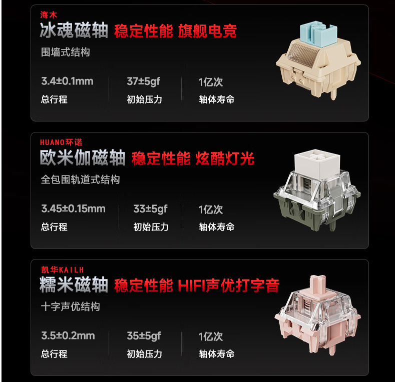 其中冰魂磁軸歐米伽磁軸,冰魂磁軸更偏向競技,初始37gf觸發壓力,手感紮實,能降低誤觸概率;歐米伽磁軸用了透明上蓋,觸發力度較輕,透光性更好,燈光表現更出彩