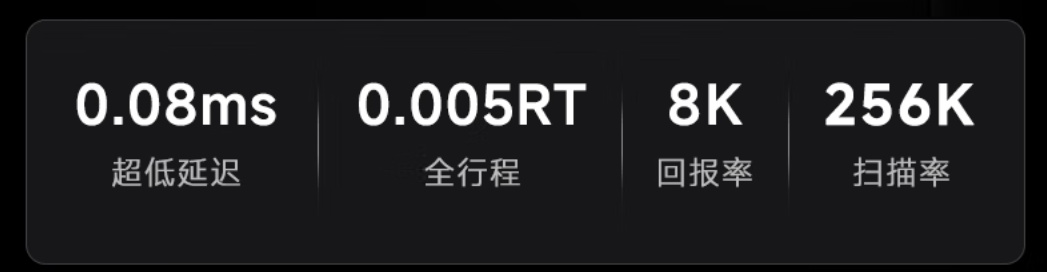 性能方面,支持8KHz回報率,RT精度可達0.001mm可調,單鍵掃描率256K,全鏈路延遲低至0.28ms,在這個價位完全沒毛病,屬於目前旗艦磁軸的主流水平
