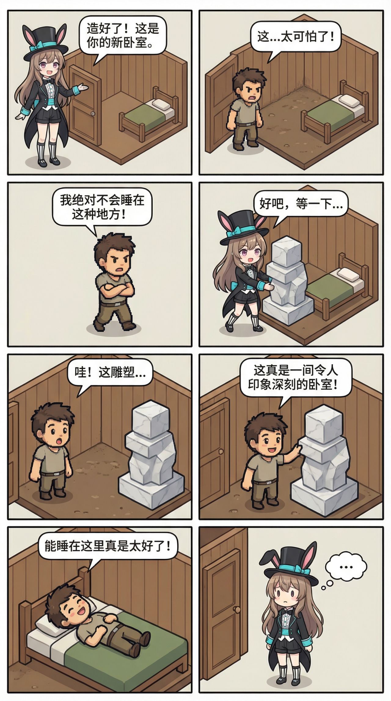 4、雕塑可以大幅提升房間觀感及美觀度,殖民者在房間觀感高的房間娛樂、用餐、睡眠會獲得心情加成