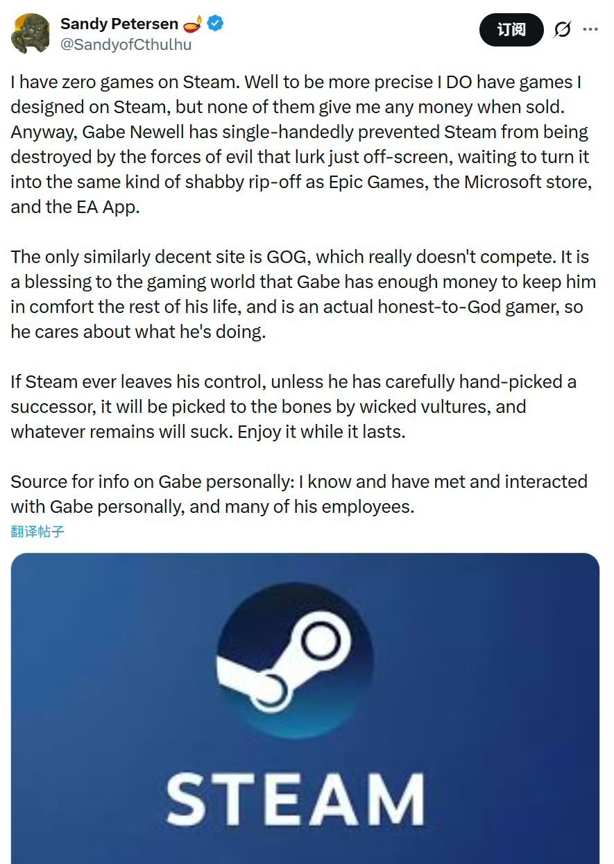 如果有一天 Steam 脫離了他的掌控,除非他精心挑選了一位繼任者,否則它會被邪惡的禿鷲啃得只剩骨頭,剩下的東西也會變得爛透了,趁現在還在,好好享受吧