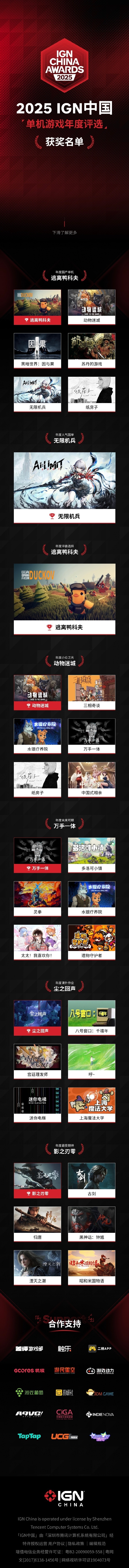 2025 IGN中國單機遊戲年度評選(IGN China Awards)是一次由 IGN 中國編輯團隊發起,以過去近一年間(北京時間2024年11月1日到2025年10月31日內),由國產團隊開發並上線的優秀單機遊戲產品爲對象舉辦的評選活動。