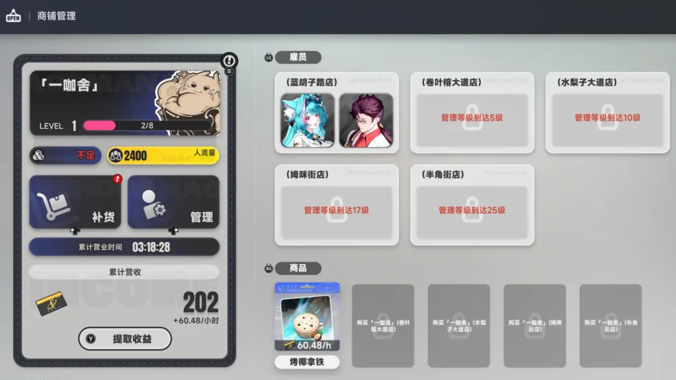 玩法方面,遊戲有一個“都市大亨”系統,裏面包含多種內容。比如“一咖舍”,這是一個比較淺度的模擬經營玩法,每天補貨即可。