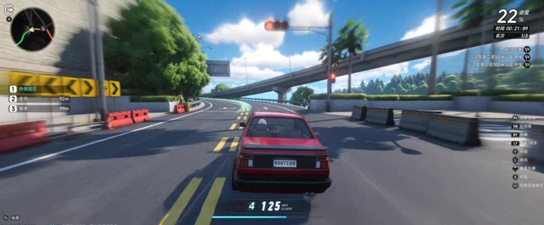 順便提一下駕車手感:非常稀爛。相比二測,轉彎時車輛重心不再錯誤內傾,而是能正常外傾,這一點有改進。但最大問題是轉向沒有線性——用鍵盤時,按下A就是直接左轉,這沒問題;但手柄也沒有線性轉向,直接打滿。