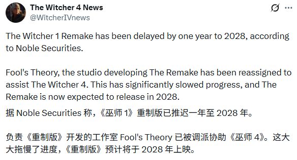 根据长期关注CD Projekt股票的波兰老牌经纪投资银行Noble Securities披露,《巫师》初代重制版已推迟至2028年。负责该项目的Fool’s Theory工作室已被重新调配,协助《巫师4》的开发工作。这一决定显著延缓了《巫师》系列首部作品重制版的开发进度。
