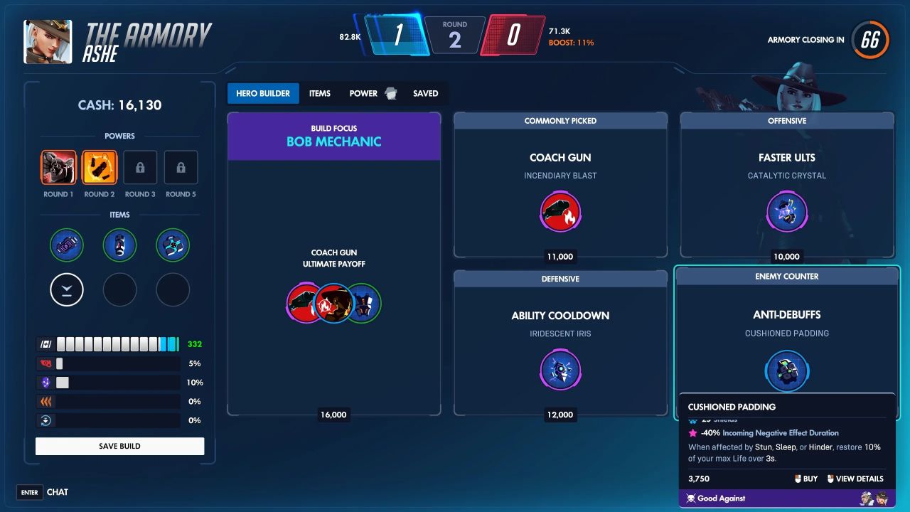 第1回合,你会看到所选英雄的三个高人气搭配选项。一键选择一个威能和三个物品,游戏体验丝滑流畅。